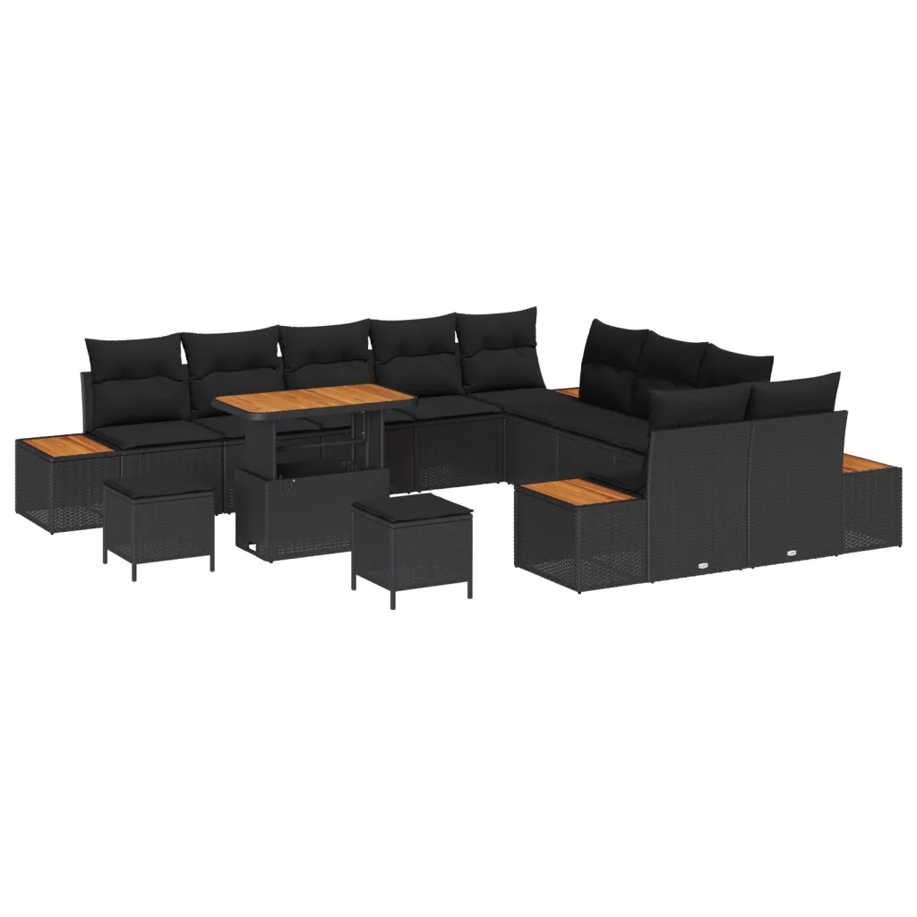13 részes Kerti Kanapé Szett Párnákkal Fekete Polirattan Akác