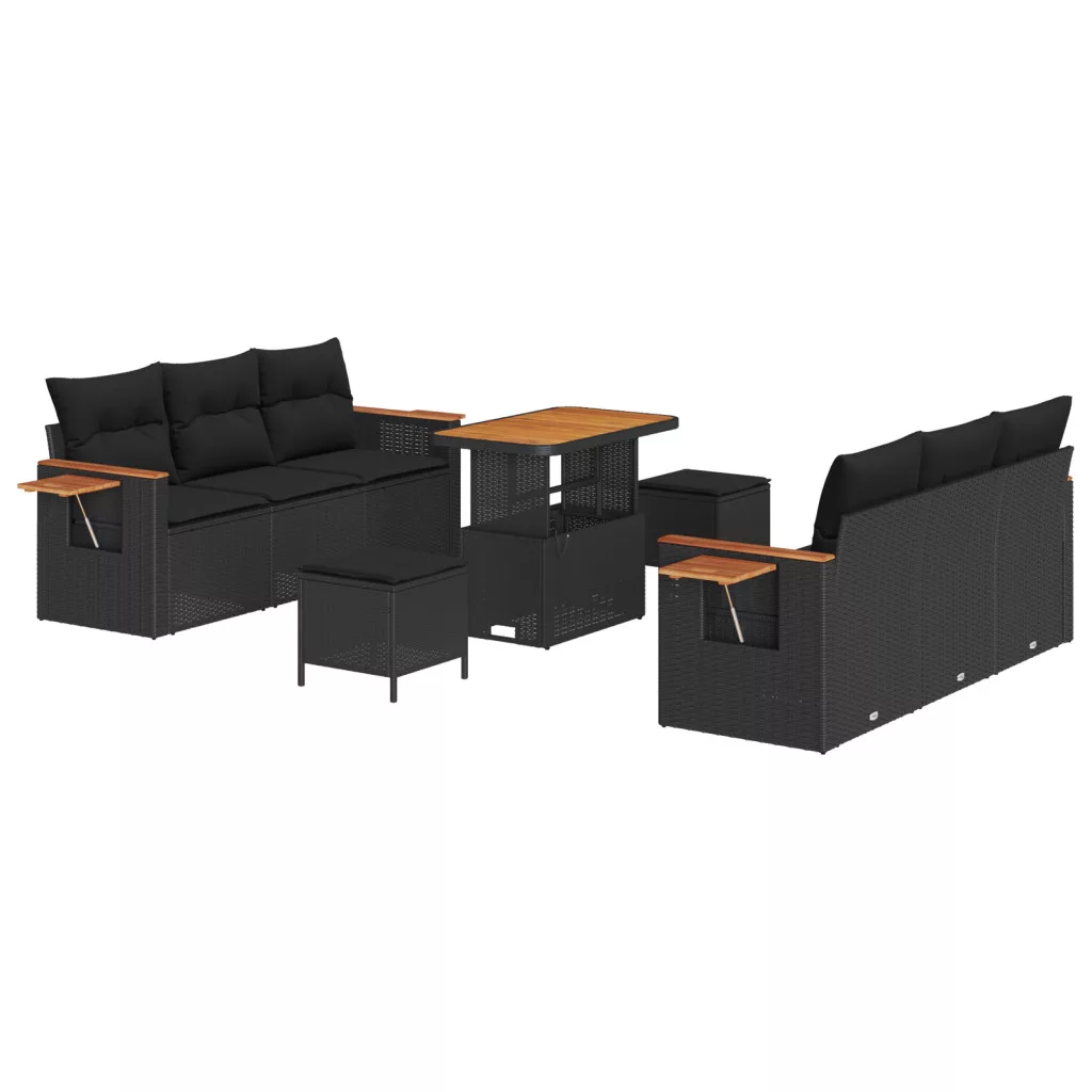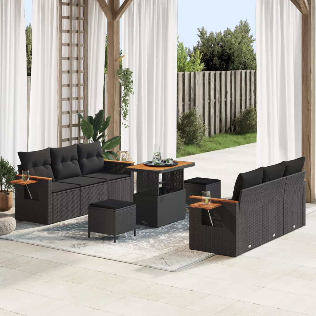 9 darabos kerti kanapé készlet párnákkal fekete poli rattan akáccal