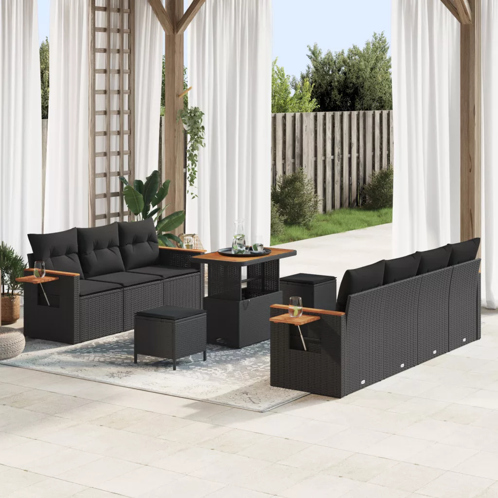 10 darabos Kerti Kanapé Szett Párnákkal Fekete Polirattan Akácia