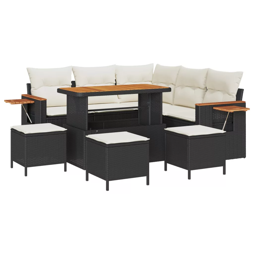 9 darabos Kert Sofa Szett Párnákkal Fekete Polirattan Akáciával