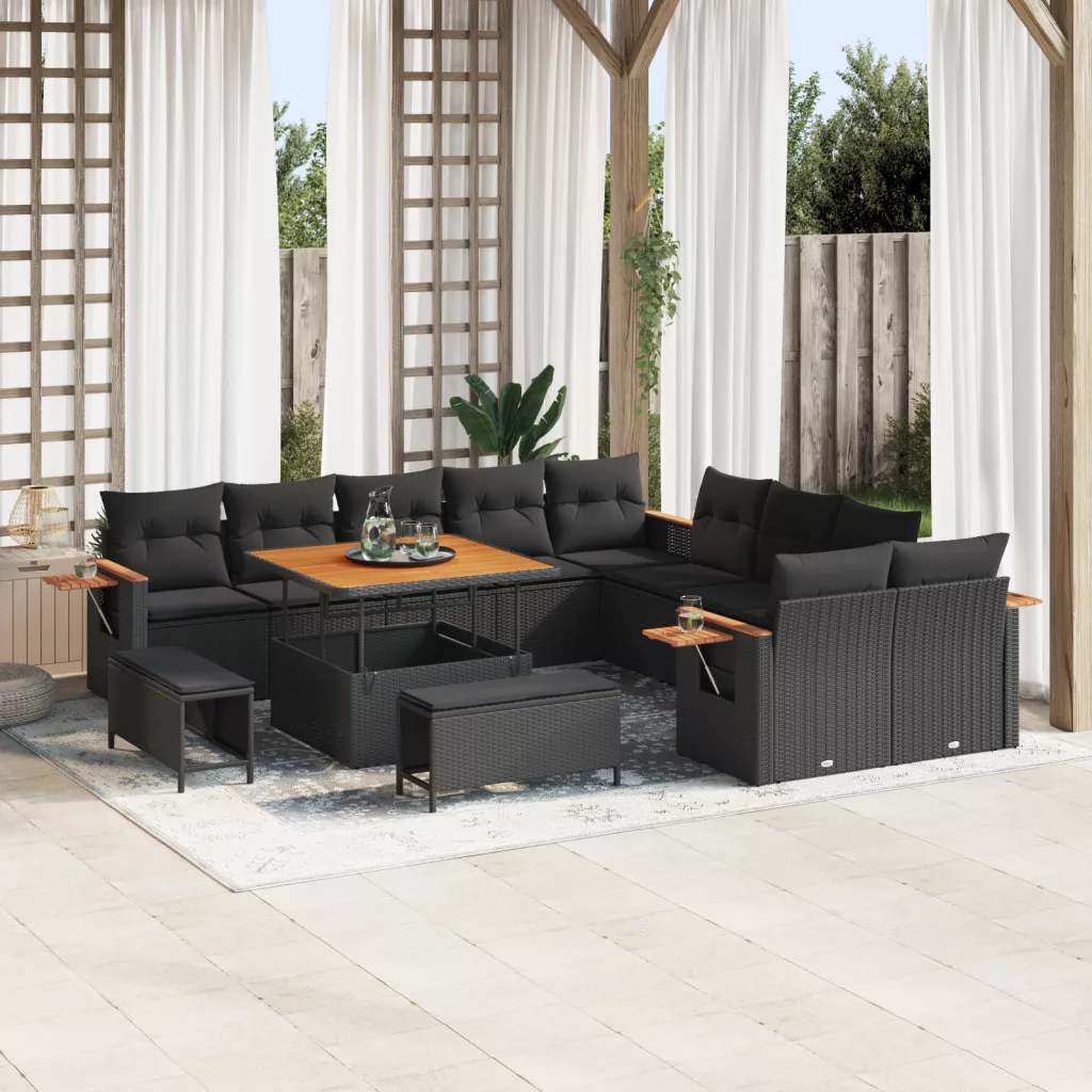 13 részes kerti kanapé szett párnákkal fekete poli ratán akáccal