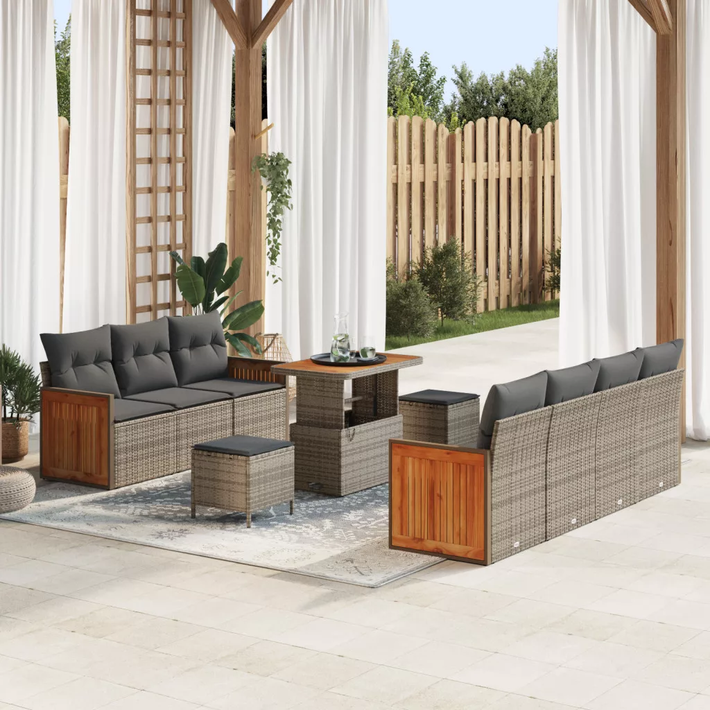 10 Darabos Kerti Kanapé Szett Párnákkal Szürke Polirattan Akáccal