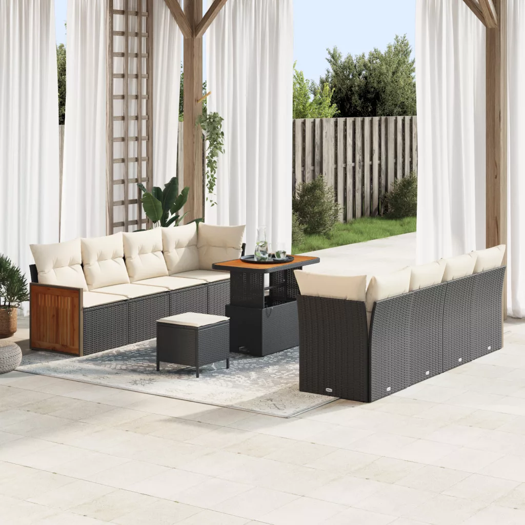 11 Részes Kerti Kanapészett Párnákkal Fekete Poli Rattan Akáccal
