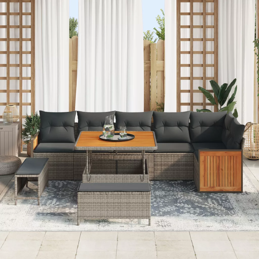 9 darabos Kerti Kanapé Szett Párnákkal Szürke Poli Rattan Akác