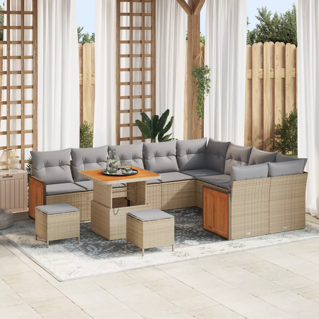 12 Részes Kerti Kanapé Szett Párnákkal Bézs Poli Rattan Akácia