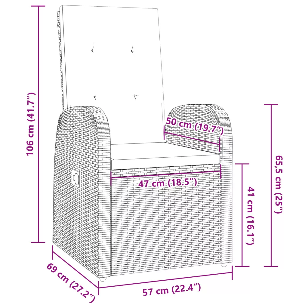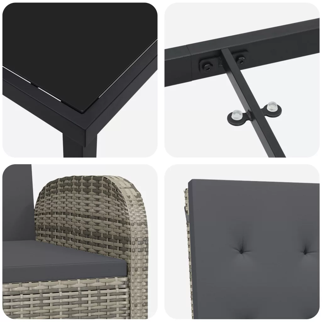 Ez a dönthető kerti szék szett modern megjelenésével és praktikus kényelmével tökéletes teraszokra, erkélyekre vagy kültéri terekre. A legjobb minőségű PE rattanból készült, ezek a székek esztétikusak és kényelmesek, jó helyet adnak a pihenésre, miközben élvezed a természet szépségeit. Az állítható döntési mechanizmus több szöget kínál, tökéletes a könyvvel való lazításhoz vagy a naplemente nézéséhez. Időjárásálló anyagokból készült, ezek a székek bátran állnak az elemekkel, tartósak és jól néznek ki, így kevesebb gondot okoznak a kültéri szórakozáshoz. A könnyű felépítés lehetővé teszi, hogy egyszerűen áthelyezd őket a kedved szerint. Vastag párnáival extra kényelmet adnak, amit imádni fogsz a hosszú nyári délutánokon. Az összeszerelés pofon egyszerű; minden eszköz benne van, így pillanatok alatt berendezheted a kültéri ülőhelyedet és elkezdheted élvezni. Maximum 110 kg ülésenként. Ügyeljen a nyílt tűz és más erős hőforrások veszélyére a termék közelében.