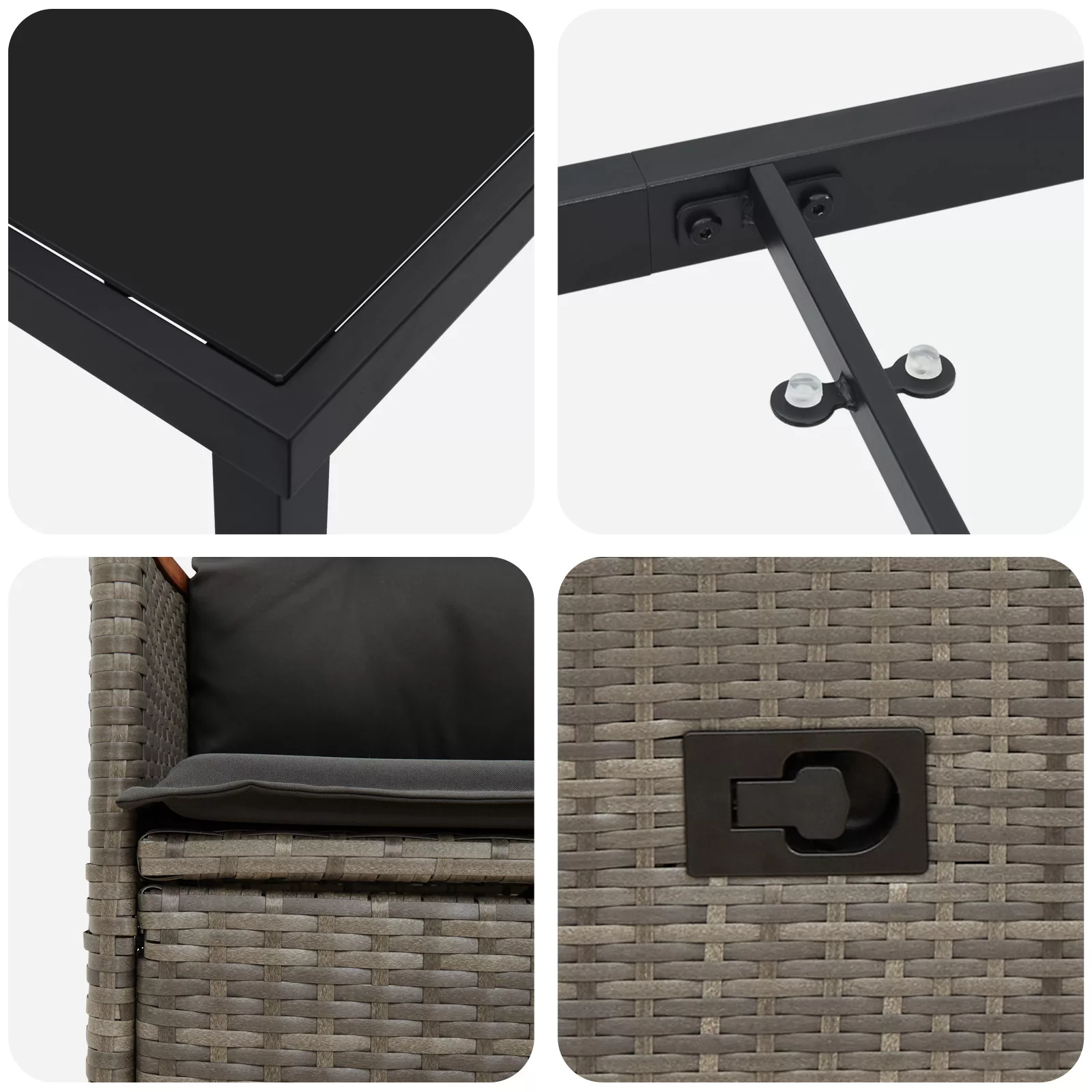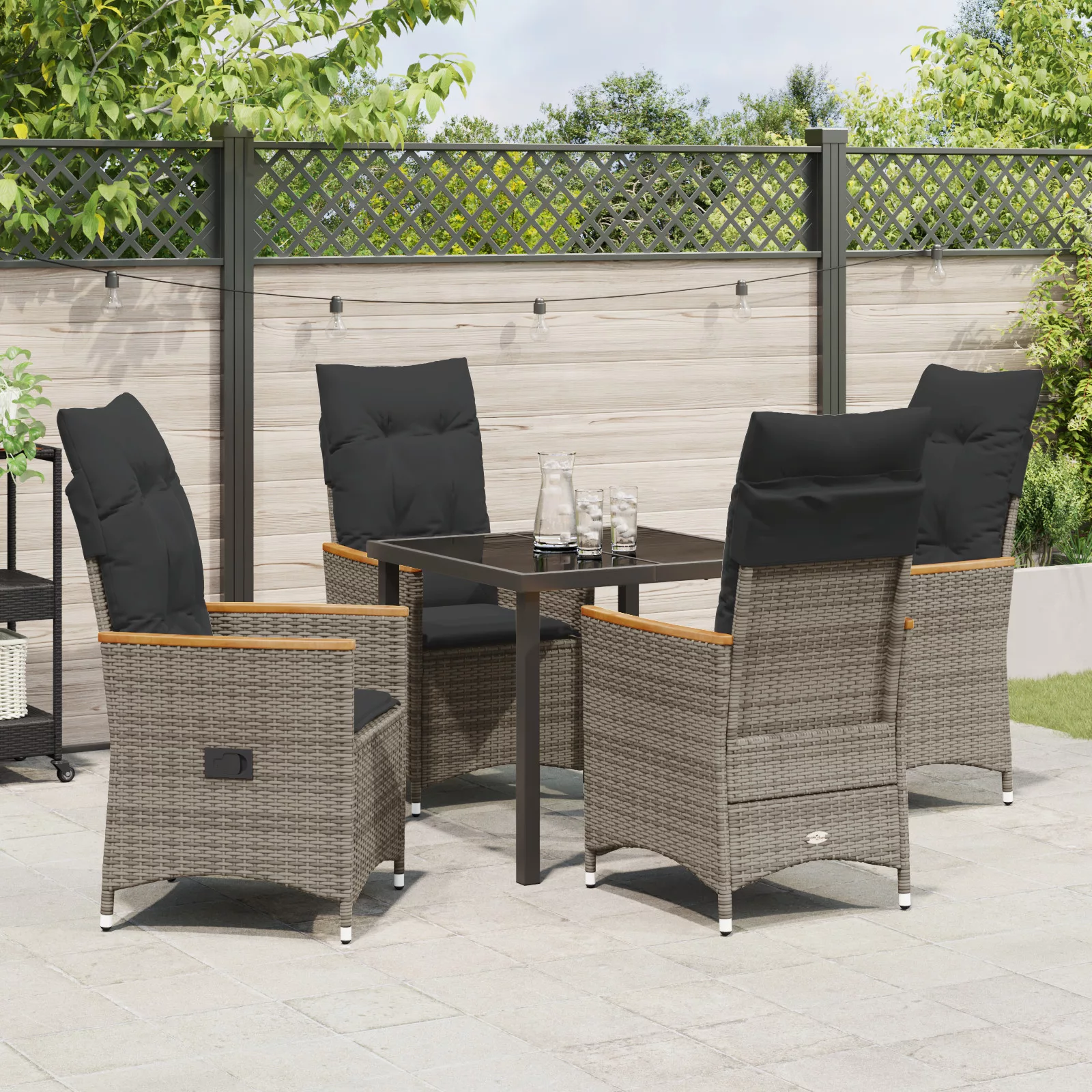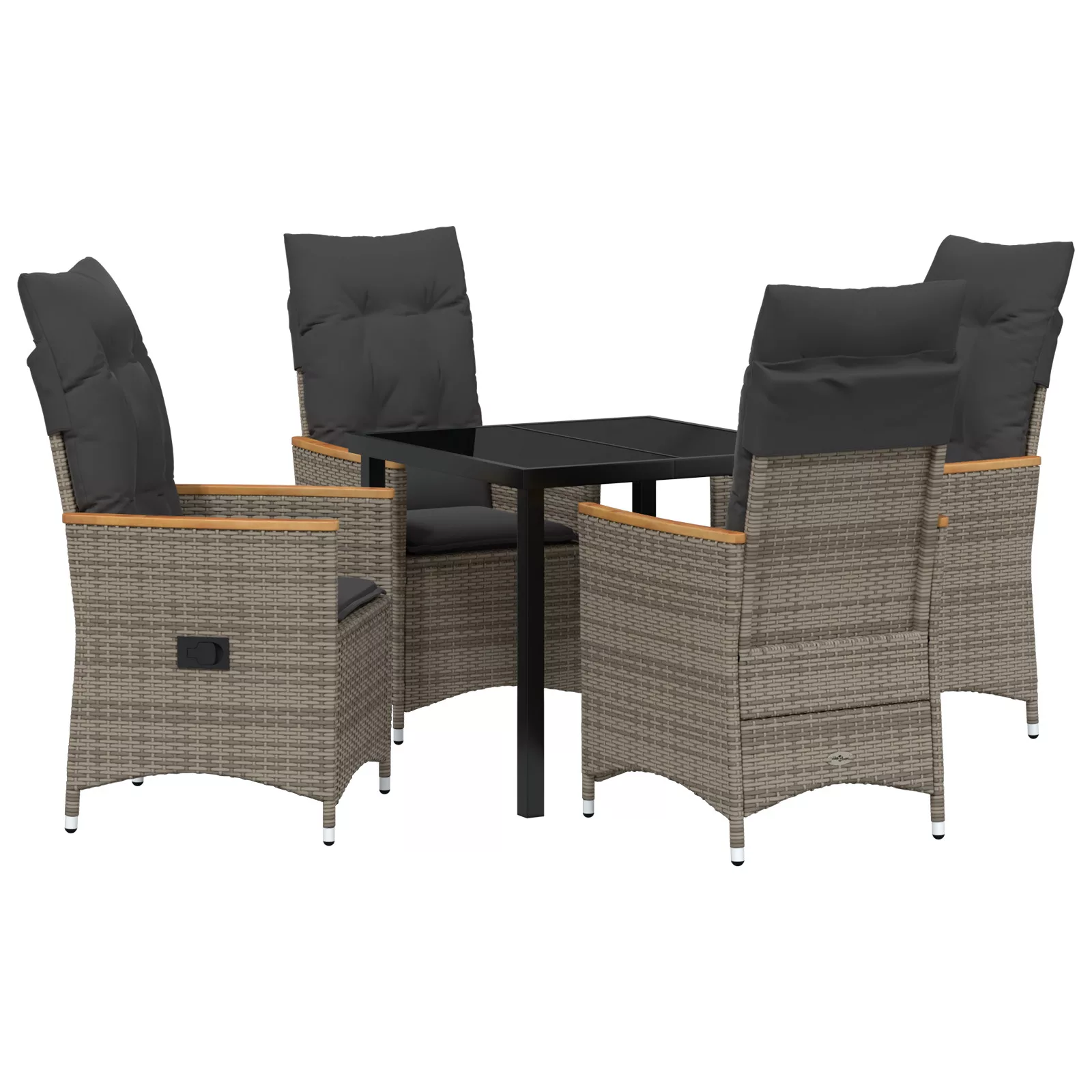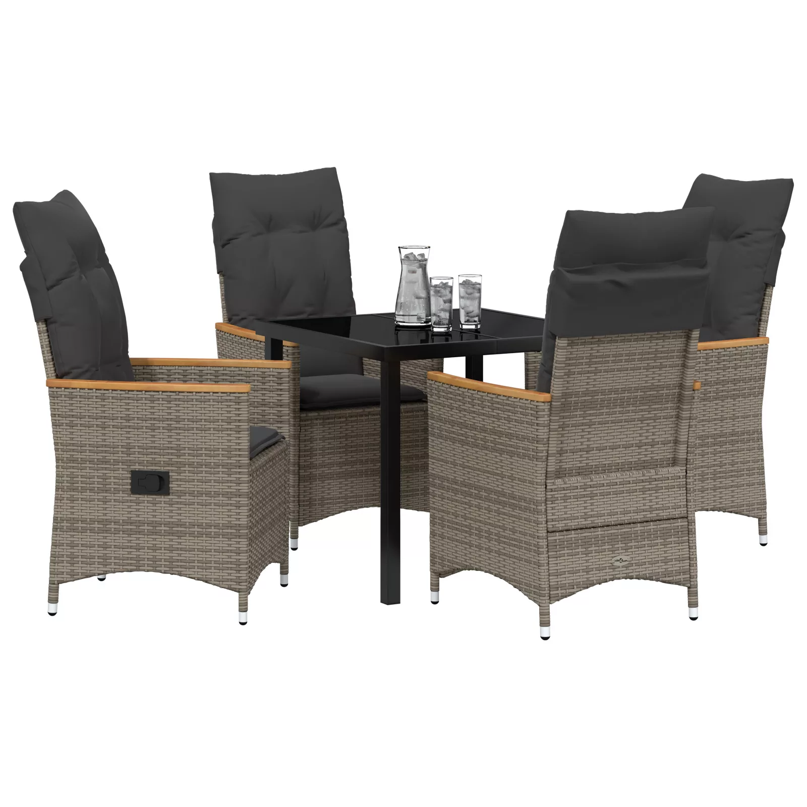 Kiszállítás tartalma: 1 x asztal, 4 x Dönthető kerti szék, 4 x ülőpárna, 4 x háttámpárna