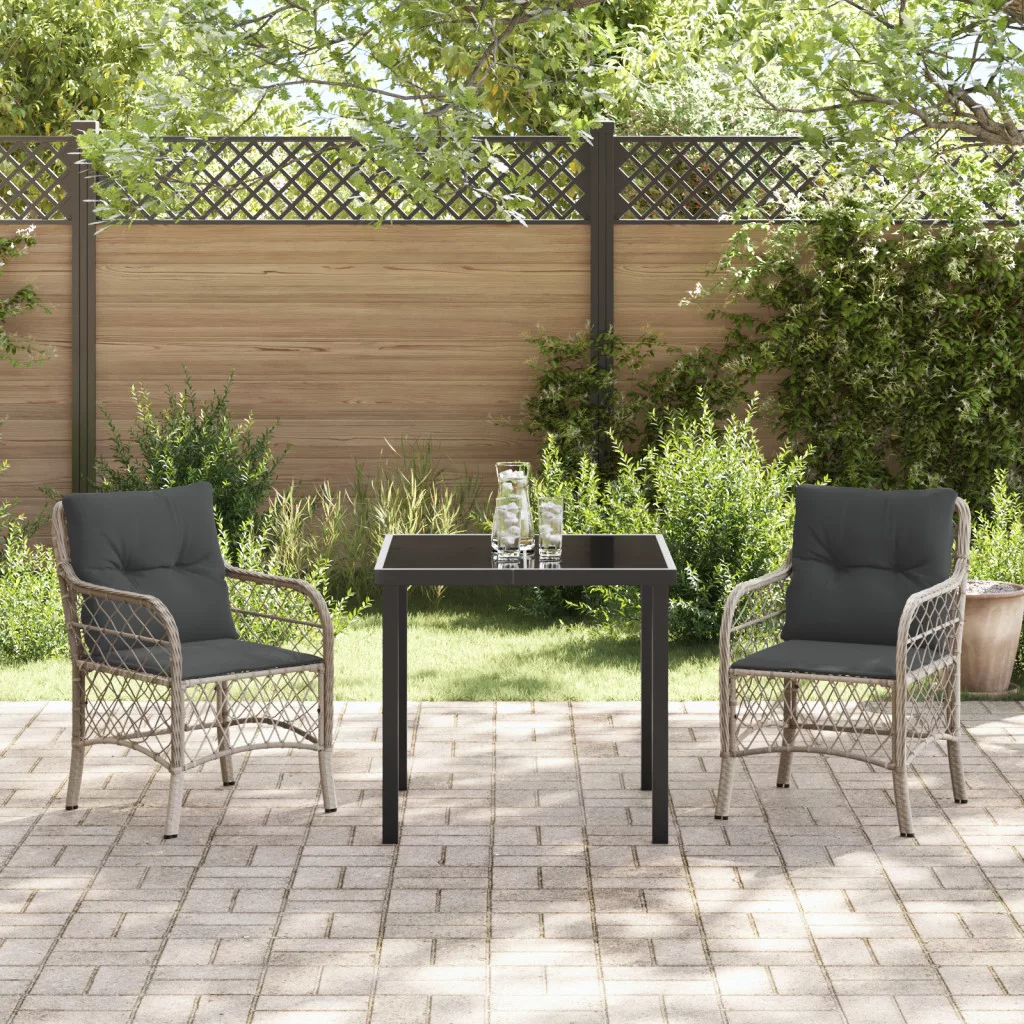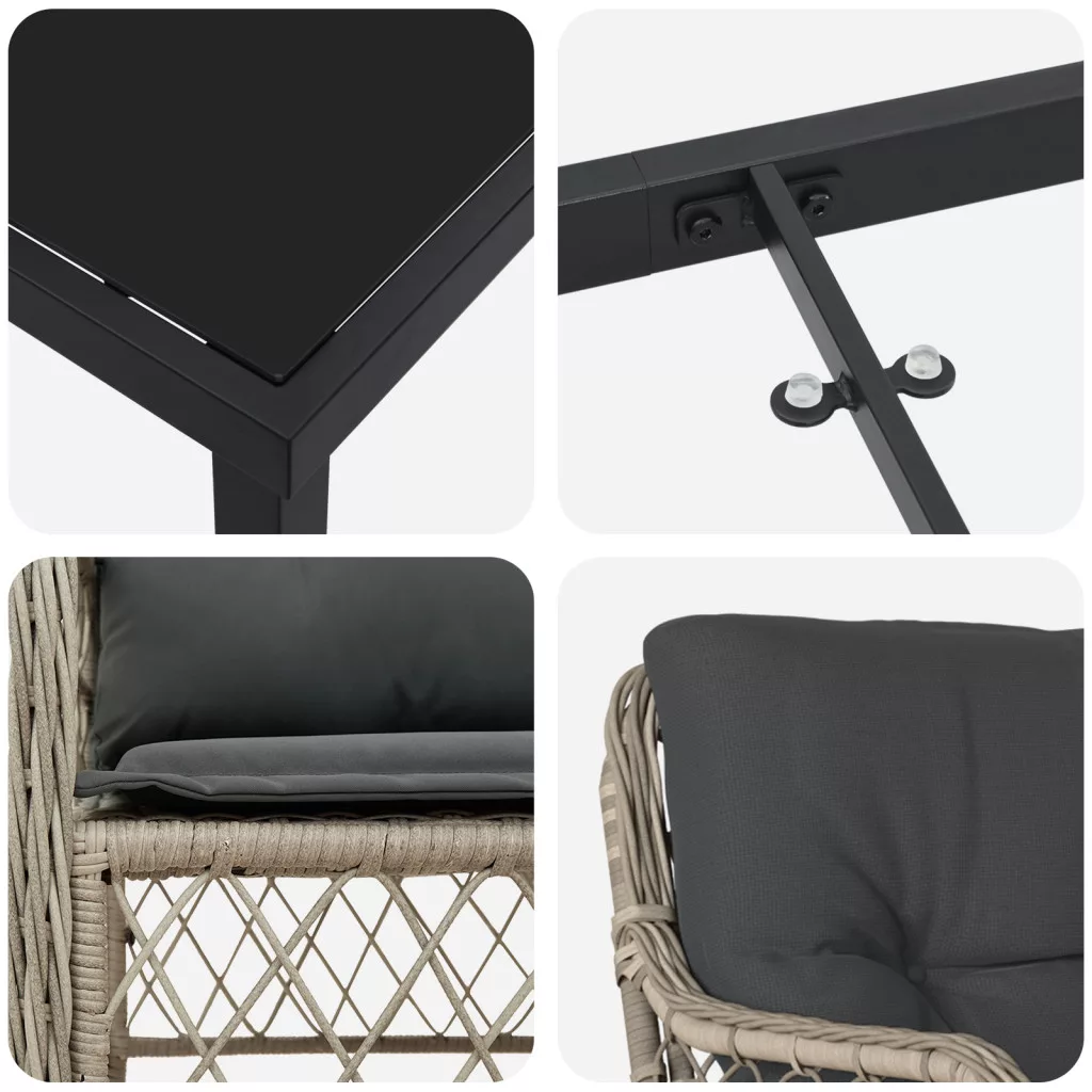 Ez a Kerti Étkező Szett modern megjelenésű, stílusos világosszürke poli rattanból van, ami eleganciát hoz a kültéri helyekhez. Tökéletes teraszokhoz, erkélyekhez, a kényelmes székek puha antracit párnákkal remek helyet adnak étkezéshez vagy pihenéshez. Kényelmes Ülés: A vastag párnák remek ülési élményt nyújtanak, tökéletes kültéri étkezésekhez vagy csak a lazításhoz. Pihenhetsz a barátaiddal vagy a családoddal ezeken a kényelmes székeken. Tartósság: Erős PE rattanból készült, ez a kerti szett az időjárás viszontagságait is jól bírja anélkül, hogy elvesztené a kinézetét. Időjárásálló, így sokáig tart. Könnyű Karbantartás: A levehető és mosható párnahuzatoknak köszönhetően egyszerű a szett tisztítása. Csak zipzározz le, dobd be a mosógépbe, és máris frissek. Masszív Váz: A porszórt acél erős alapot ad, így biztonságosan használhatod. Ez az anyagkombináció azt jelenti, hogy a bútor sokáig jó állapotban lesz. Ideális Méret: A méretei 58,5 x 67 x 86 cm, ez a szett szépen elfér kisebb terekben anélkül, hogy az étkezési lehetőségekből engednél. Maximum 110 kg ülésenként. Ügyeljen a nyílt tűz és más erős hőforrások veszélyére a termék közelében.