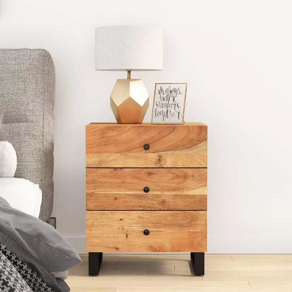 Vigyen ipari bájt szobájába ezzel az éjjeliszekrénnyel! Otthona praktikus és dekoratív kiegészítője lesz. Tömör akácfa: A tömör akácfa egy gyönyörű, természetes anyag. Az akácfa egy trópusi keményfa, amely sűrű erezetű, stabil és tartós.Bőséges tárolóhely: A 3 fiókkal felszerelt ágy melletti asztal bőséges tárolóhelyet kínál alapvető holmijai kézközelben történő rendezett tárolásához.Stabil lap: A kisszekrény masszív lapja tökéletes helyet nyújt csészék, könyvek és egyéb dísztárgyak elhelyezésére.Fémlábak: A hálószobabútor fém lábai szilárdságot és stabilitást biztosítanak. Figyelem:A dőlés megakadályozása érdekében a terméket a mellékelt tartóelem segítségével rögzíteni kell a falhoz. Megjegyzés:Az egyszerű összeszerelés érdekében minden termékhez mellékelünk összeszerelési útmutatót.A színe és erezete darabonként változhat, így minden bútordarab egyedi, és kissé eltér a többitől. A kiszállítás véletlenszerűen történik, biztosítva terméke exkluzivitását és egyediségét.