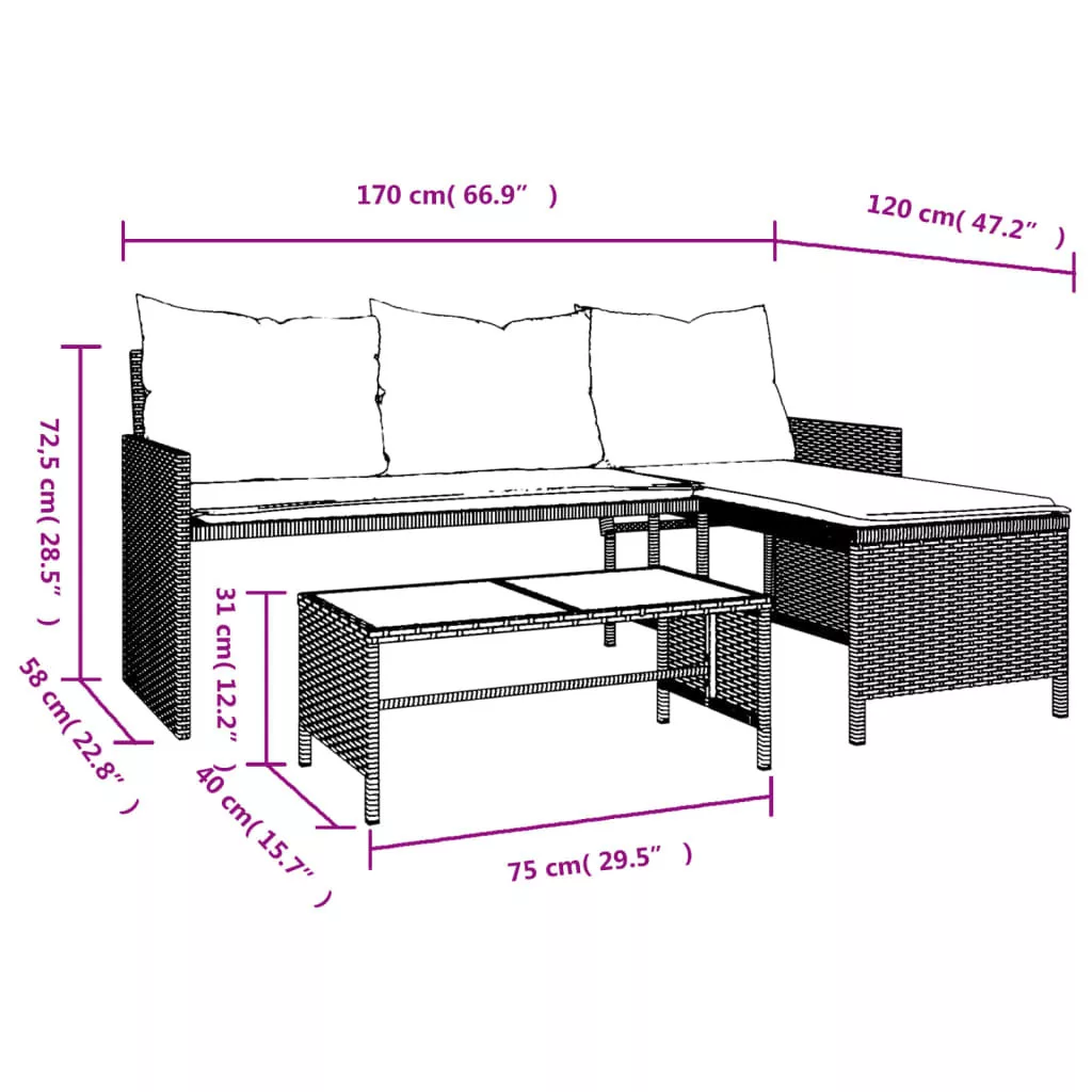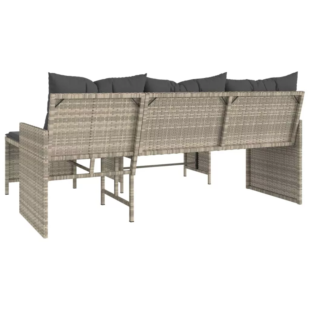 L-alakú szürke polyrattan kerti kanapé asztallal és párnákkal