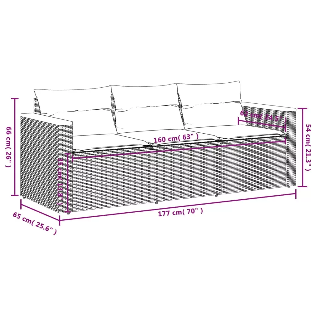 Pihenjen és élvezze a szabad levegőt ezen a kényelmes 3 személyes kerti kanapén! Tartós anyag: A PE rattan, más néven polyrattan, egy erős, kevés karbantartást igénylő szintetikus anyag, amely úgy néz ki, mint a természetes rattan. Könnyű, könnyen tisztítható, tartóssága és időjárásálló tulajdonságai miatt gyakran használják kültéri bútorok készítéséhez.Kényelmes ülőélmény: Ez a vastagon bélelt párnákkal kiegészített kültéri bútor kényelmes ülőélményt kínál.Levehető és mosható huzat: Ezek az ülőpárnák levehető huzattal rendelkeznek az egyszerű mosás és karbantartás érdekében.Robusztus és stabil váz: A porszórt acél váz biztosítja, hogy a kerti bútor erős és stabil legyen a mindennapi kültéri használathoz. Jó tudni:A kültéri bútor szépségének megőrzése érdekében javasoljuk, hogy vízálló huzattal fedje be. Maximum 110 kg ülésenként. Ügyeljen a nyílt tűz és más erős hőforrások veszélyére a termék közelében.