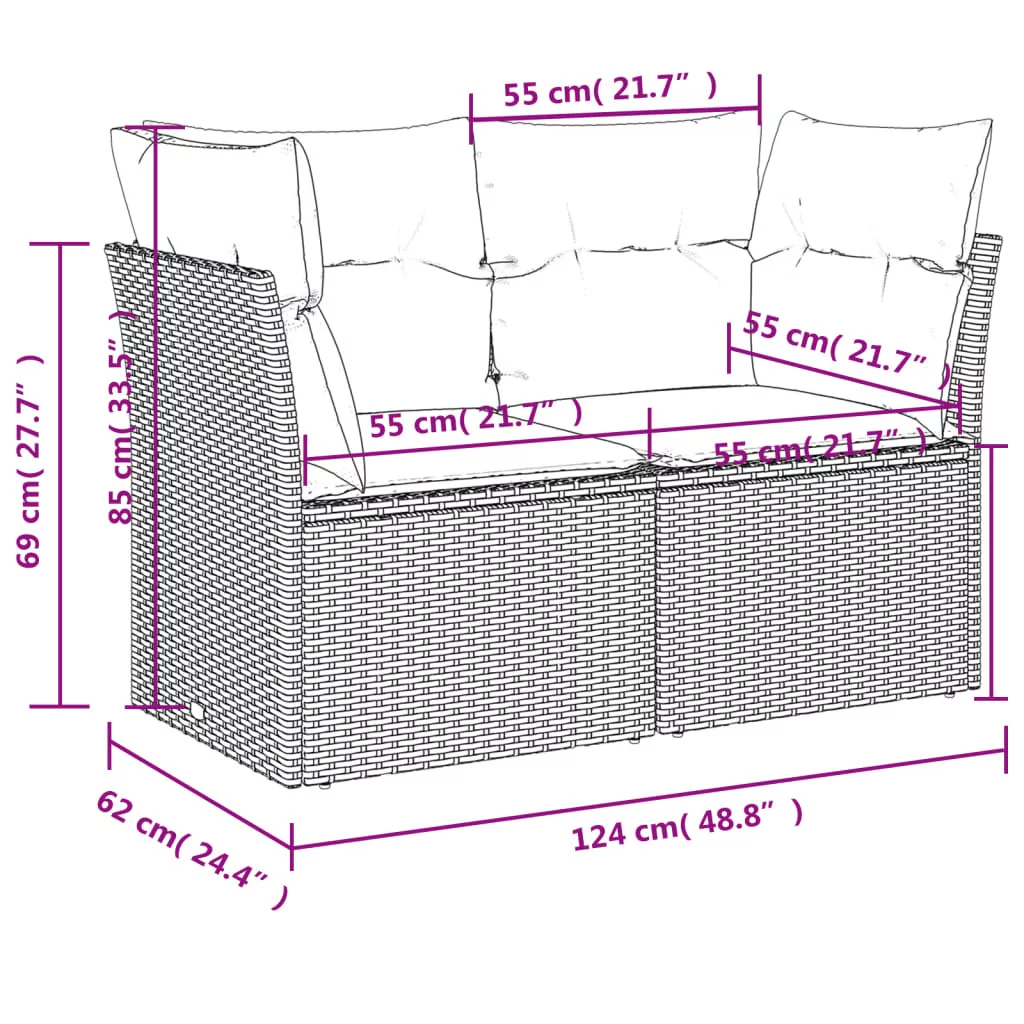 Pihenjen és élvezze a szabad levegőt ezen a kényelmes 2 személyes kerti kanapén! Tartós anyag: A PE rattan, más néven polyrattan, egy erős, kevés karbantartást igénylő szintetikus anyag, amely úgy néz ki, mint a természetes rattan. Könnyű, könnyen tisztítható, tartóssága és időjárásálló tulajdonságai miatt gyakran használják kültéri bútorok készítéséhez.Kényelmes ülőélmény: Ez a vastagon bélelt párnákkal kiegészített kültéri bútor kényelmes ülőélményt kínál.Levehető és mosható huzat: Ezek az ülőpárnák levehető huzattal rendelkeznek az egyszerű mosás és karbantartás érdekében.Moduláris kialakítás: Ez a kerti bútorkészlet moduláris felépítésű, így teljesen rugalmas és könnyen mozgatható, így személyre szabott kerti bútor-elrendezést alakíthat ki. Jó tudni:A kültéri bútor szépségének megőrzése érdekében javasoljuk, hogy vízálló huzattal fedje be.
