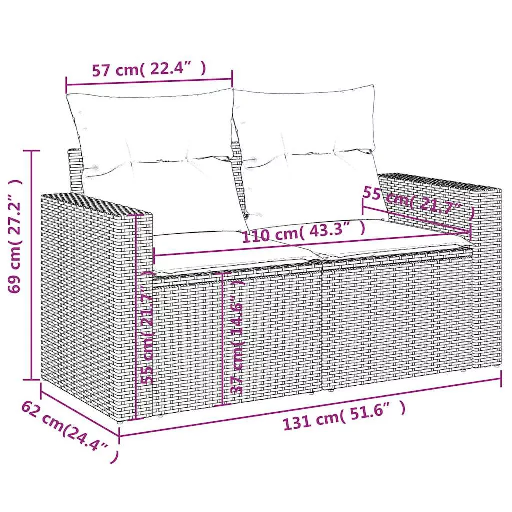 Pihenjen és élvezze a szabad levegőt ezen a kényelmes 2 személyes kerti kanapén! Tartós anyag: A PE rattan, más néven polyrattan, egy erős, kevés karbantartást igénylő szintetikus anyag, amely úgy néz ki, mint a természetes rattan. Könnyű, könnyen tisztítható, tartóssága és időjárásálló tulajdonságai miatt gyakran használják kültéri bútorok készítéséhez.Kényelmes ülőélmény: Ez a vastagon bélelt párnákkal kiegészített kültéri bútor kényelmes ülőélményt kínál. A széles karfák kényelmes helyet biztosítanak a mobiltelefon, a csészék vagy más apró tárgyak könnyen elérhető helyen tartásához.Levehető és mosható huzat: Ezek az ülőpárnák levehető huzattal rendelkeznek az egyszerű mosás és karbantartás érdekében.Moduláris kialakítás: Ez a kerti bútorkészlet moduláris felépítésű, így teljesen rugalmas és könnyen mozgatható, így személyre szabott kerti bútor-elrendezést alakíthat ki. Jó tudni:A kültéri bútor szépségének megőrzése érdekében javasoljuk, hogy vízálló huzattal fedje be.