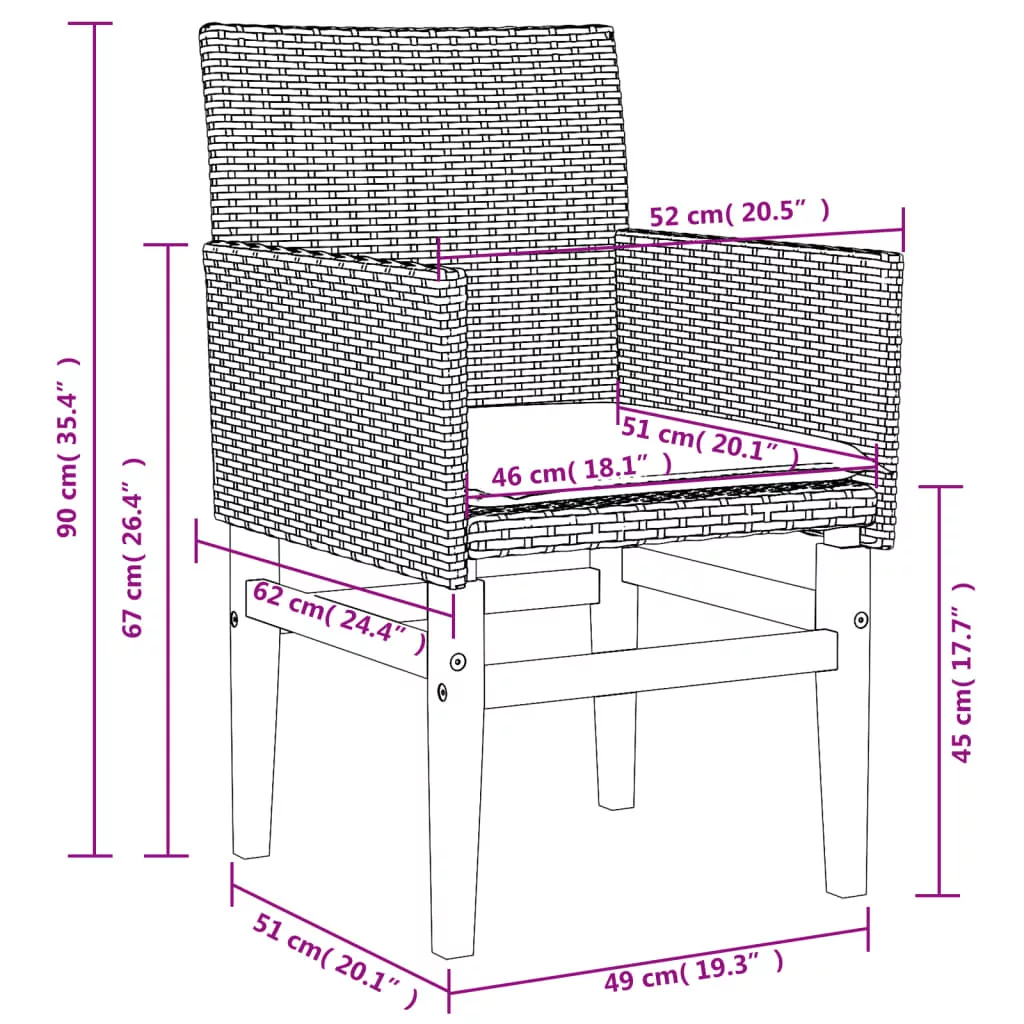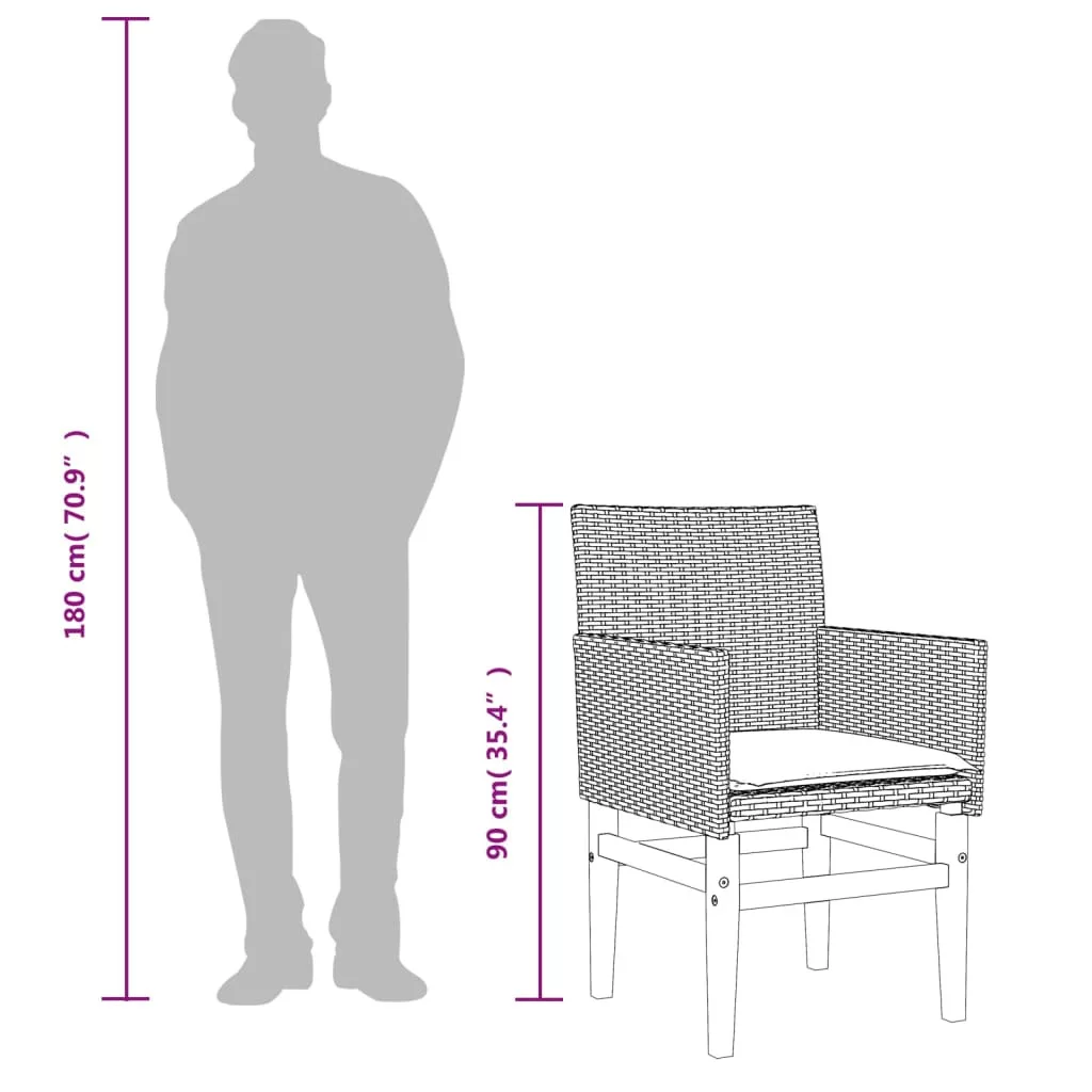 Pihenjen és élvezze a szabad levegőt ezeken a kényelmes kerti székeken! Tartós anyag: A PE rattan, más néven polyrattan, egy erős, kevés karbantartást igénylő szintetikus anyag, amely úgy néz ki, mint a természetes rattan. Könnyű, könnyen tisztítható, tartóssága és időjárásálló tulajdonságai miatt gyakran használják kültéri bútorok készítéséhez.Kényelmes ülőélmény: Ez a vastagon bélelt párnákkal kiegészített kültéri bútor kényelmes ülőélményt kínál.Levehető és mosható huzat: Ezek az ülőpárnák levehető huzattal rendelkeznek az egyszerű mosás és karbantartás érdekében.Robusztus és stabil váz: A fa és porszórt acél váz biztosítja, hogy a kerti bútor erős és stabil legyen a mindennapi kültéri használathoz. Jó tudni:A kültéri bútor szépségének megőrzése érdekében javasoljuk, hogy vízálló huzattal fedje be. Maximum 110 kg ülésenként. Ügyeljen a nyílt tűz és más erős hőforrások veszélyére a termék közelében.