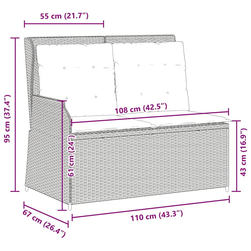 Pihenjen és élvezze a szabad levegőt ezen a kényelmes, dönthető kerti padon! Tartós anyag: A PE rattan, más néven polyrattan, egy erős, kevés karbantartást igénylő szintetikus anyag, amely úgy néz ki, mint a természetes rattan. Könnyű, könnyen tisztítható, tartóssága és időjárásálló tulajdonságai miatt gyakran használják kültéri bútorok készítéséhez.Állítható háttámla: Ez a kerti ülés fogantyúkkal rendelkezik. A háttámlát a fogantyú meghúzásával tetszőleges pozícióba állíthatja, és gyorsan visszahelyezheti eredeti helyzetébe.Kényelmes ülőélmény: Ez a vastagon bélelt párnákkal kiegészített kültéri bútor kényelmes ülőélményt kínál.Levehető és mosható huzat: Ezek az ülőpárnák levehető huzattal rendelkeznek az egyszerű mosás és karbantartás érdekében.Robusztus és stabil váz: A porszórt acél váz biztosítja, hogy a kerti bútor erős és stabil legyen a mindennapi kültéri használathoz. Jó tudni:A kültéri bútor szépségének megőrzése érdekében javasoljuk, hogy vízálló huzattal fedje be. Maximum 110 kg ülésenként. Ügyeljen a nyílt tűz és más erős hőforrások veszélyére a termék közelében.