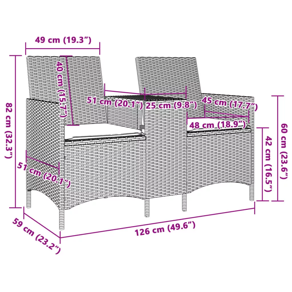 Pihenjen és élvezze a szabad levegőt ezen a kényelmes kerti kanapén! Tartós anyag: A PE rattan, más néven polyrattan, egy erős, kevés karbantartást igénylő szintetikus anyag, amely úgy néz ki, mint a természetes rattan. Könnyű, könnyen tisztítható, tartóssága és időjárásálló tulajdonságai miatt gyakran használják kültéri bútorok készítéséhez.Kényelmes központi asztal: Ez a kerti bútor egy beépített központi asztallal rendelkezik, amely kényelmes helyet biztosít a legfontosabb dolgok könnyen elérhető közelségben tartásához.Kényelmes ülőélmény: Ez a vastagon bélelt párnákkal kiegészített kültéri bútor kényelmes ülőélményt kínál.Levehető és mosható huzat: Ezek az ülőpárnák levehető huzattal rendelkeznek az egyszerű mosás és karbantartás érdekében.Robusztus és stabil váz: A porszórt acél váz biztosítja, hogy a kerti bútor erős és stabil legyen a mindennapi kültéri használathoz. Jó tudni:A kültéri bútor szépségének megőrzése érdekében javasoljuk, hogy vízálló huzattal fedje be. Maximum 110 kg ülésenként. Ügyeljen a nyílt tűz és más erős hőforrások veszélyére a termék közelében.