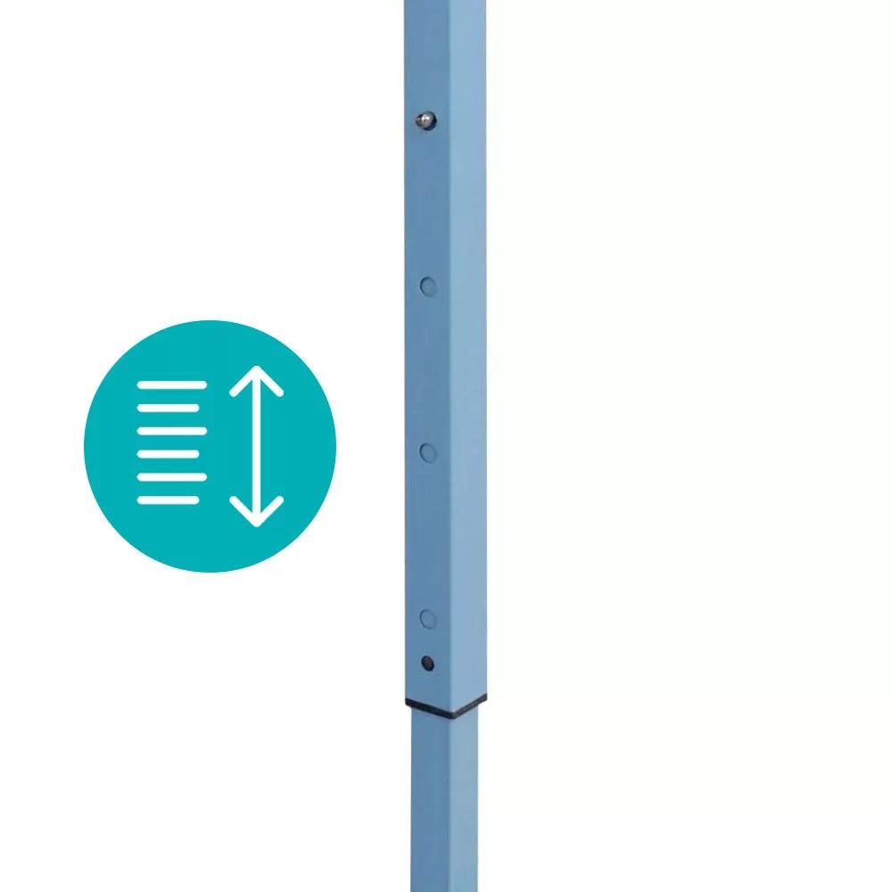 A sarkoknál található karikák, a huzalok és rögzítő szegek segítségével stabilabban áll a pavilon. (A kiegészítők is /4 db huzal, 4 db rögzítő szeg/ a csomag részét képezik.)- Magassága: 1,90m, teljes magassága 3,5m- A termék súlya: 29kg- A csomag súlya: 30kg- A csomag mérete: 138x37x21cm- Anyag: PVC, fém, oxford anyag- Színe: A ponyva fehér, a lábak kékek!