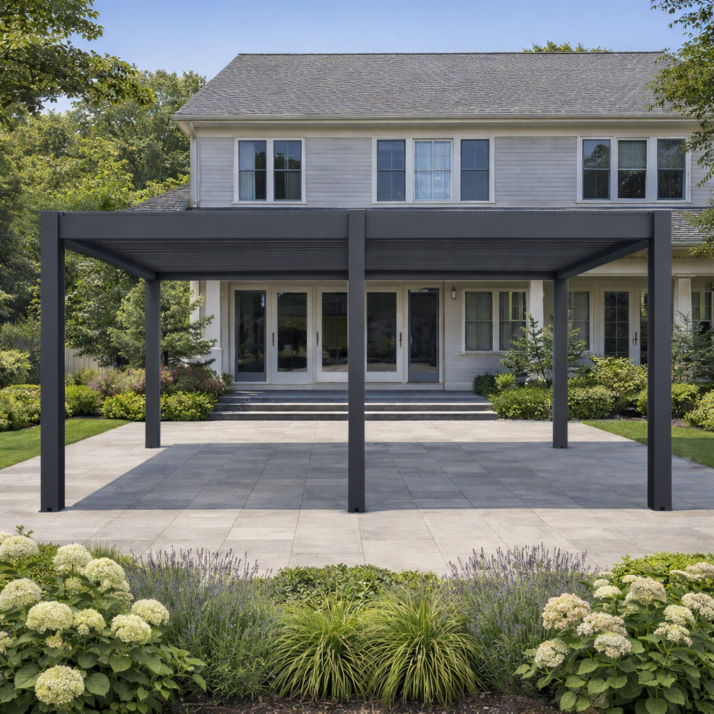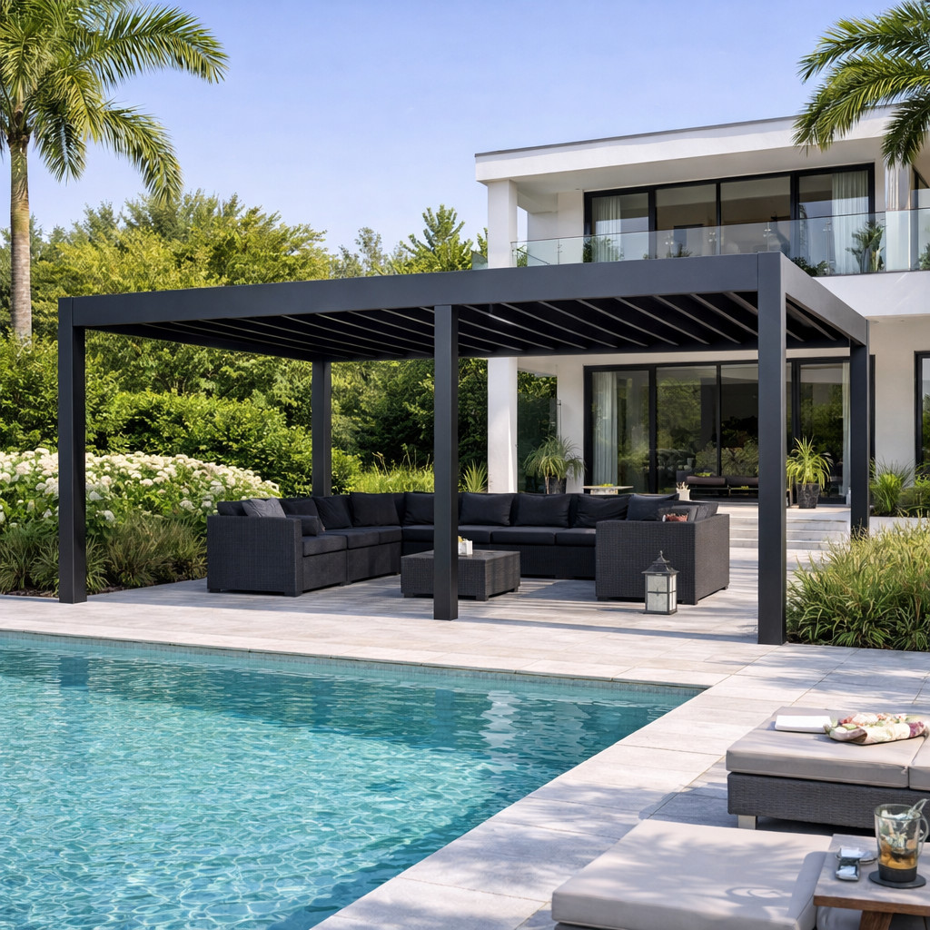 Elektromosan állítható tetőlamellák, a szerkezet teljesen zárt lamellákkal kisebb, közepes esőzéseknél teljesen vízálló, nagyobb, hevesebb esőzésnél ereszthet be minimálisan vizet!