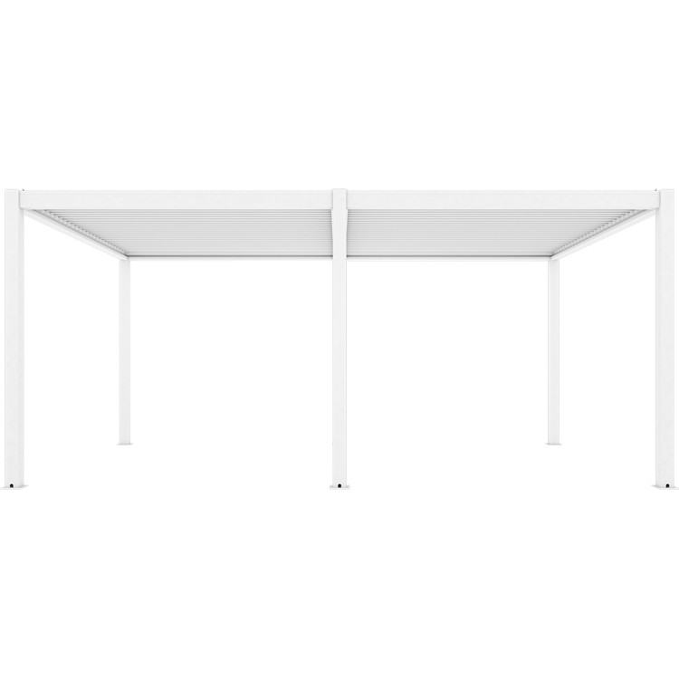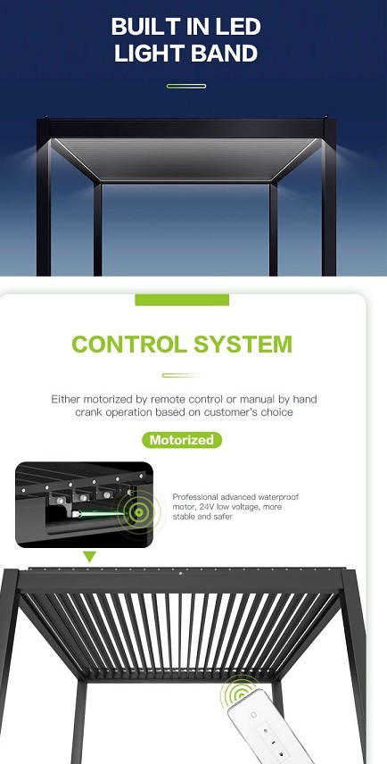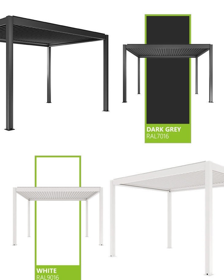 Modellnév: GreenAwn GR-9300Elektromosan állítható tetőlamellák, a szerkezet teljesen zárt lamellákkal kisebb, közepes esőzéseknél teljesen vízálló, nagyobb, hevesebb esőzésnél ereszthet be minimálisan vizet!Teljes súly kb. 280kgVáz anyaga: alumíniumVáz anyagvastagsága: 1,4 mm – 2 mmteljes méret kb.: 2,964 x 5,748 x 2,503 m (szélesség x hosszúság x magasság)A talp anyagvastagsága: 8mmLáb mérete: 12cm x 12cmTalp mérete: 18cm x18 cmLamella anyagvastagsága: 1,1 mmBővíthető 3x4 vagy 3x6m pergolávalLED fényekkel felszerelveSMD2835 – LED szalaglámpaSzínhőmérséklet: 6000K10mm széles, 5mm vastag a LED szalagMűködési feszültség: 24VMéterenkénti teljesítmény: 1 W/mA szín és hőmérséklet fix!A tetőlamellákat mozgató motor és LED fény is vezeték nélküli távirányítóval vezérelhető.A pergolához CE certifikáció és SGS tanusítvány tartozik.Szélteszt: A konstrukció szélcsatornában minden oldalról 5x30percig lett tesztelve 10,15,20,24 és 28m/s (100,80km/h) szélsebességre. Ezeket a teszteket probléma nélkül abszolválta a szerkezet, ekkora szélsebességet huzamos ideig is képes elviselni.A termék szerelési útmutatóját ide kattintva éri el.3-4 óra alatt kényelmesen összeszerelhető és kész az álomterasz.Az opcionálisan vásárolható oldalfalak 420g/m2 PVC anyagból készültek.