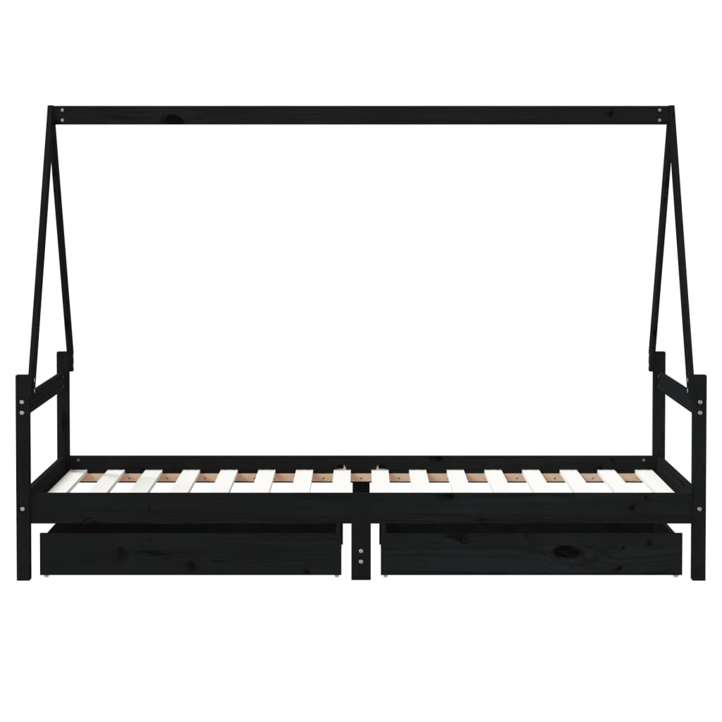 fekete tömör fenyőfa gyerekágykeret fiókokkal 80 x 200 cm