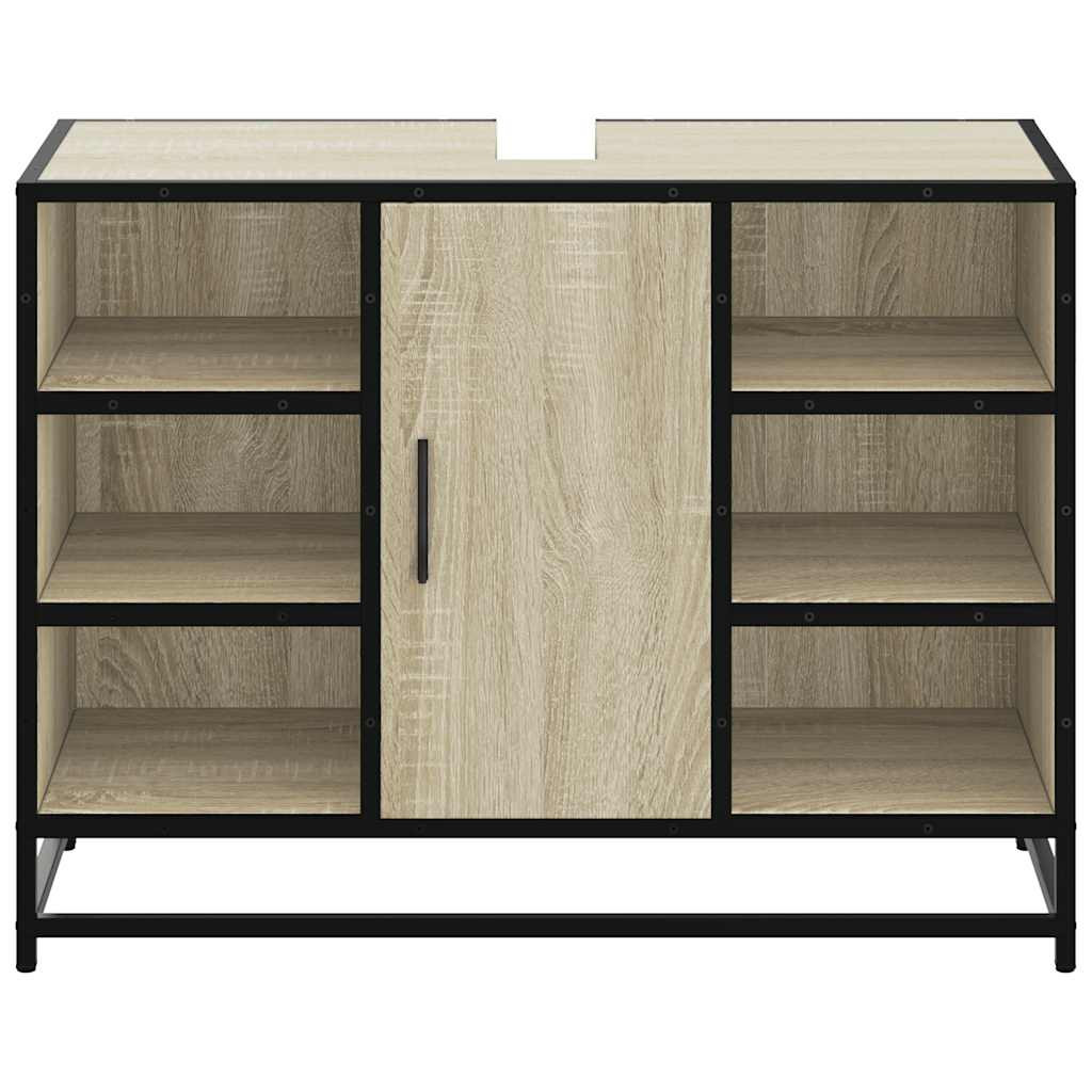 Ez a fürdőszobai mosdószekrény fürdőszobája nagyszerű kiegészítője lesz, miközben retro stílusú és elegáns megjelenést kölcsönöz neki! Stabil és tartós anyag: A szerelt fa tartós és stabil anyag sima felülettel, amely ellenáll a nedvességnek, a vetemedésnek és a hasadásnak, így megbízható választás különféle célokhoz.Stabil és hosszú élettartamú keret: A fürdőszobai hiúság fémkerete ipari stílussal gazdagítja a belső teret, és kivételes tartósságot, stabilitást és korrózióállóságot biztosít.Bőséges tárolóhely: Az fürdőszobai asztal bőséges tárolóhelyet kínál alapvető kellékei elérhető közelségben történő, rendezett tárolásához.Praktikus szekrénylap: A mosdószekrény felső lapja nyílással rendelkezik, így ideális a mosdókagyló elhelyezésére.Vonzó megjelenés: A fürdőszobaszekrény feltűnő kialakítása sima vonalaival és kifinomult mintáival kiemeli a tér általános megjelenését, így bármely helyiség fénypontja lesz. Figyelem:A felborulás elkerülése érdekében ezt a terméket a mellékelt fali rögzítőeszközzel kell használni.