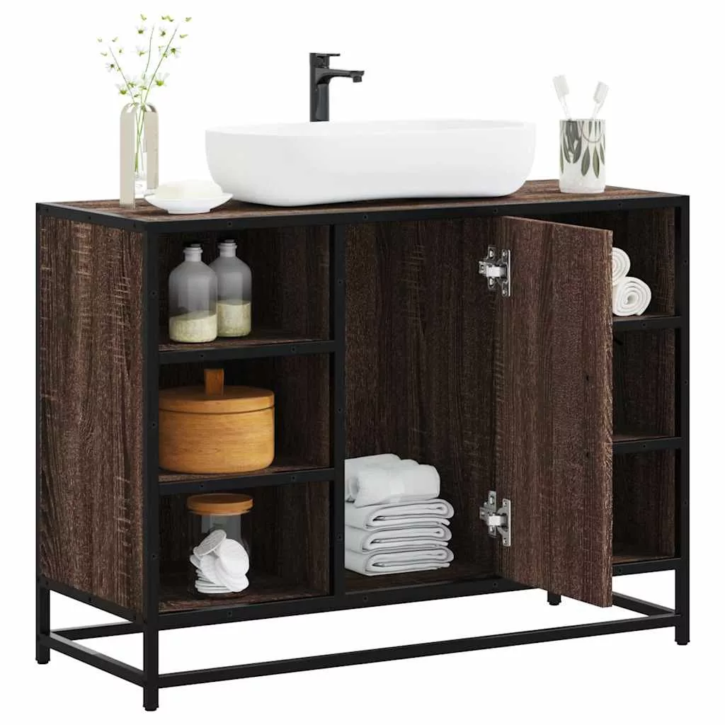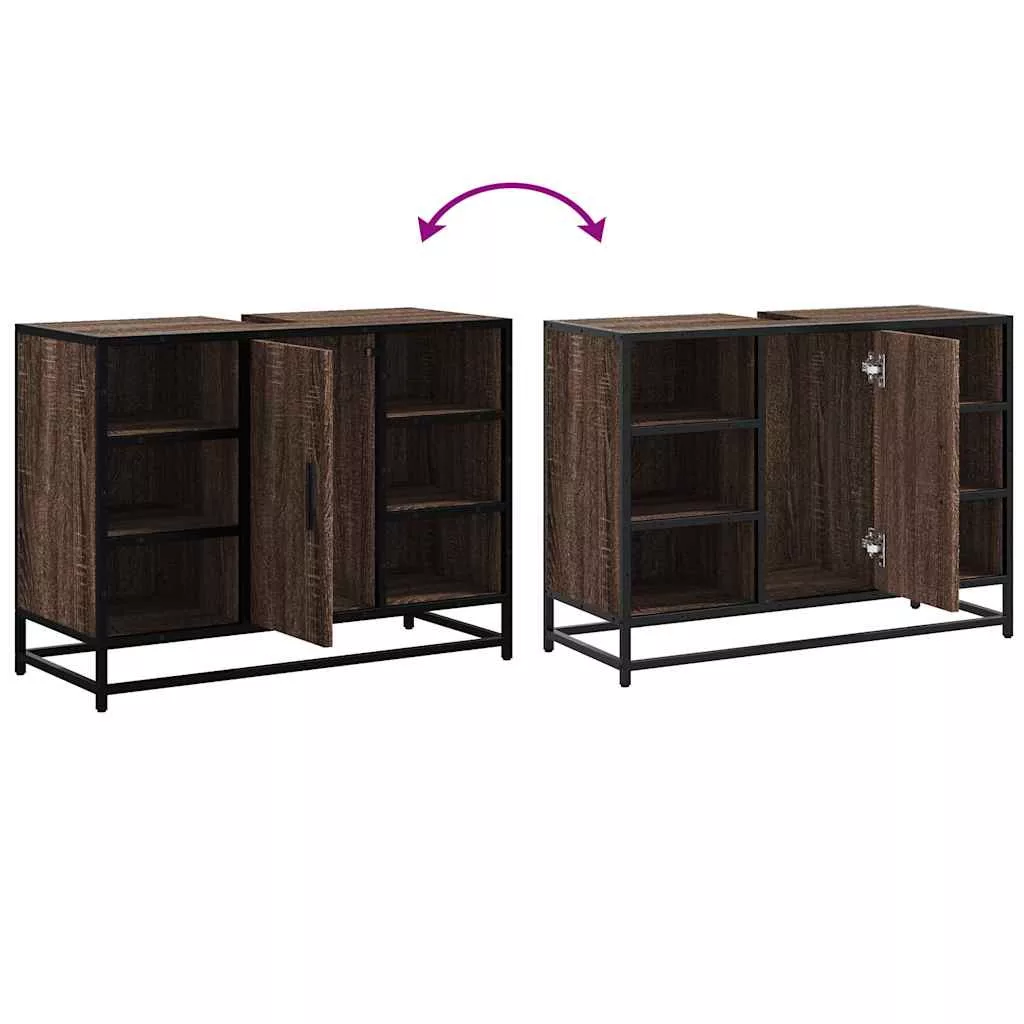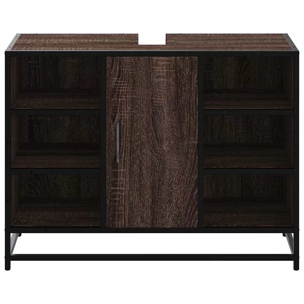 Ez a fürdőszobai mosdószekrény fürdőszobája nagyszerű kiegészítője lesz, miközben retro stílusú és elegáns megjelenést kölcsönöz neki! Stabil és tartós anyag: A szerelt fa tartós és stabil anyag sima felülettel, amely ellenáll a nedvességnek, a vetemedésnek és a hasadásnak, így megbízható választás különféle célokhoz.Stabil és hosszú élettartamú keret: A fürdőszobai hiúság fémkerete ipari stílussal gazdagítja a belső teret, és kivételes tartósságot, stabilitást és korrózióállóságot biztosít.Bőséges tárolóhely: Az fürdőszobai asztal bőséges tárolóhelyet kínál alapvető kellékei elérhető közelségben történő, rendezett tárolásához.Praktikus szekrénylap: A mosdószekrény felső lapja nyílással rendelkezik, így ideális a mosdókagyló elhelyezésére.Vonzó megjelenés: A fürdőszobaszekrény feltűnő kialakítása sima vonalaival és kifinomult mintáival kiemeli a tér általános megjelenését, így bármely helyiség fénypontja lesz. Figyelem:A felborulás elkerülése érdekében ezt a terméket a mellékelt fali rögzítőeszközzel kell használni.
