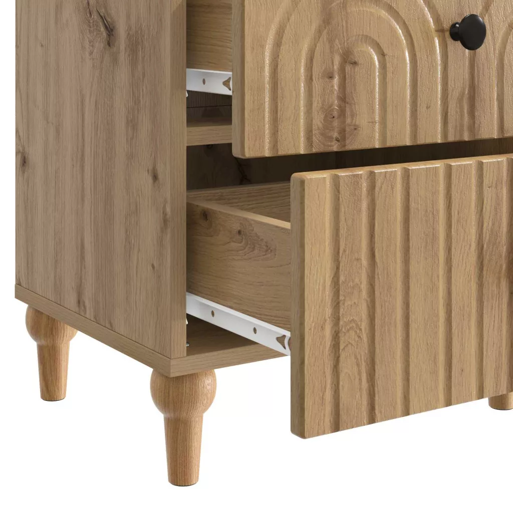 Ez a modern éjjeliszekrény egy stílusos kiegészítő minden szobához. Elegáns téglalap formájával és letisztult vonalaival, ami a kortárs dizájn jellegzetessége. A finom csíkos minta miatt könnyen beilleszthető különböző dekorációkba. A 43 x 34,5 x 48 cm-es mérete rengeteg helyet kínál az ágyad mellett, lámpáknak és könyveknek vagy más szükséges dolognak. Minimalista megjelenésével tökéletes választás mindenkinek, aki szereti a stílust és a funkciót, ideális modern otthonokhoz. Mérnöki fa kivitel: Pompás szilárdság, ellenáll a mindennapi igényeknek. A sima felülete nemcsak jól néz ki, hanem tartós is, tökéletes bármilyen szobába. Praktikus fiókok: Két fiókkal rengeteg tárolóhelyet kapsz, hogy rendben tartsd a dolgaidat. A fiókok könnyen csúsznak, így bármikor gyorsan hozzáférhetsz a szükséges dolgokhoz. Egyszerű gombfogantyúk: Funkcionális és dekoratív fogantyúkkal, amik segítenek a nyitásban és zárásban, vagyis egy kis eleganciát visznek a szekrénybe. Könnyű karbantartás: Elég csak egy nedves rongyot használni, hogy eltüntesd a port. Ez az egyszerű karbantartás segít megőrizni a bútor új állapotát. Sokoldalú elhelyezés: Éjjeliszekrényként ideális, de más helyeken is elérhető. Kompakt mérete miatt jól befér kisebb helyekre, akár tárolóként, akár díszítő elemként.