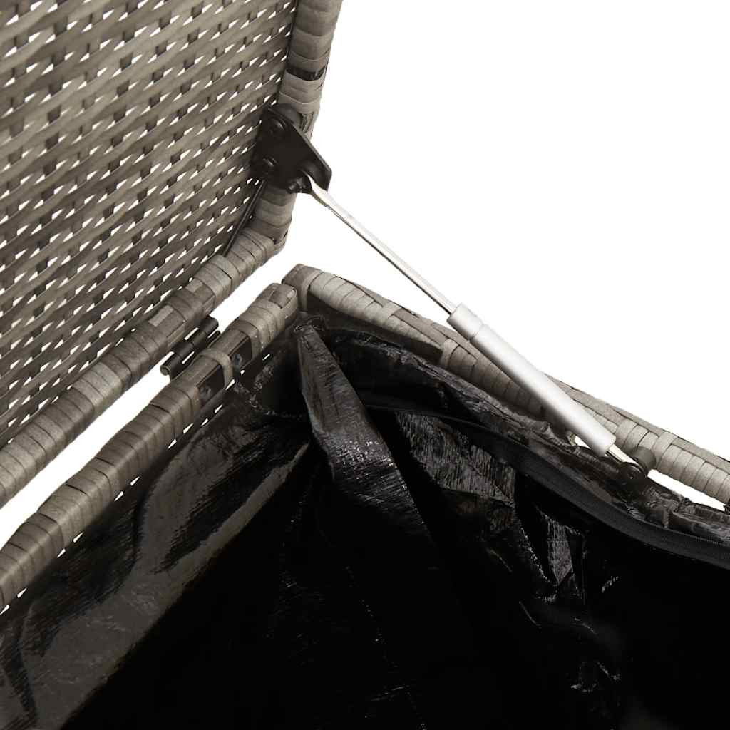Ez a kerti tárolódoboz tökéletesen alkalmas a kültéri bútorpárnák, kerti kellékek, medencetörölközők és egyéb tárgyak rendezett és könnyen hozzáférhető tárolására. Tartós anyag: A PE rattan, más néven polyrattan, egy erős, kevés karbantartást igénylő szintetikus anyag, amely úgy néz ki, mint a természetes rattan. Könnyű, könnyen tisztítható, tartóssága és időjárásálló tulajdonságai miatt gyakran használják kültéri bútorok készítéséhez.Robusztus és stabil váz: A porszórt acélváz erős, stabil, tartós, ellenáll a korróziónak és a zord időjárásnak, így biztosítja a tartós használatot.Biztonságos és könnyen nyitható és zárható: A gázrugó megkönnyíti a fedél kinyitását, és megakadályozza, hogy becsapódjon vagy becsípje az ujjakat.Tárolási funkció: A kerti bútor alatt tárolóhely található, vízálló zsákkal felszerelve a párnák, játékok és egyéb tárgyak tárolására. Jó tudni:A kültéri bútor szépségének megőrzése érdekében javasoljuk, hogy vízálló huzattal fedje be.