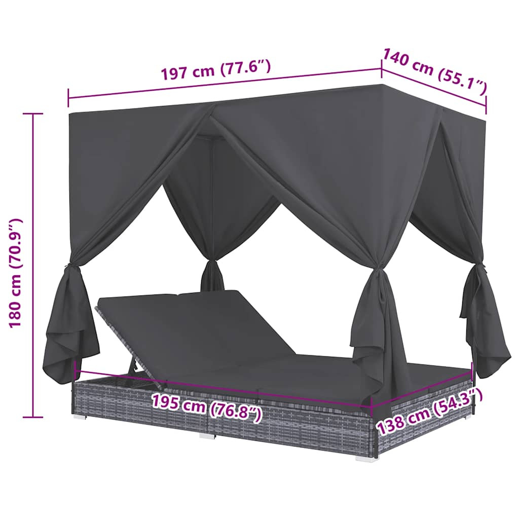 Ez a kétszemélyes polyrattan napozóágy tökéletes kombinációja a stílusnak és a funkcionalitásnak. A kültéri napozóágy időjárásálló, könnyen tisztítható PE rattanból készült. A porszórt bevonattal ellátott acélkeretnek, és a vastag puha párnáknak köszönhetően a nyugágy rendkívül stabil és kényelmes. A cipzáras párnahuzatok levehetők és moshatók. A kétszemélyes heverő mindkét oldalról 7 különböző pozícióba állítható a kényelme növelése érdekében. A négyoldalú váz köré felakasztott függönyök luxus hangulatot kölcsönöznek és távol tartják a rovarokat, miközben megfelelő árnyékot és intimitást biztosítanak. A függönyök levehetőek és eltárolhatóak, melynek köszönhetően akár szabadon élvezhető a napsütés. A napozóágyat rendkívül könnyű összeszerelni. A szállítás 1 napozóágyat, 2 nagyméretű ülőpárnát és 1 szett függönyt tartalmaz. Figyelem: A termék minőségének megőrzése érdekében javasoljuk, hogy takarja le a bútort eső, hó vagy fagy esetén.