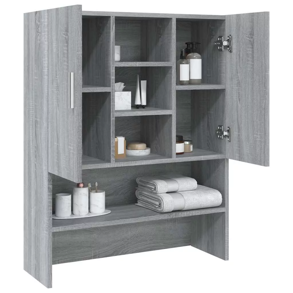 Ezzel a mosógépszekrénnyel további tárhelyet alakíthat ki és optimálisan használhatja azt fel a fürdőszobában vagy a mosókonyhában. Prémium minőségű anyag: A szerelt fa kivételes minőségű, sima felületű, szilárd, stabil, és ellenáll a nedvességnek.Bőséges tárolóhely: A 2 ajtó és a 9 rekesz bőséges tárolóhelyet kínál a mosóeszközök, tisztítószerek, piperecikkek és egyebek kézközelben történő rendezett tárolásához.Modern kialakítás: Varázsoljon modern stílust meglévő belső terébe! A modern kialakítás letisztult vonalakkal, minimalista megjelenéssel és természetes fénnyel járul hozzá a belsőépítészeti stílushoz. Figyelem:A dőlés megakadályozása érdekében a terméket a mellékelt tartóelem segítségével rögzíteni kell a falhoz. Megjegyzés:A szállítmány csak a felső szekrényt tartalmazza.Az egyszerű összeszerelés érdekében minden termékhez mellékelünk összeszerelési útmutatót.
