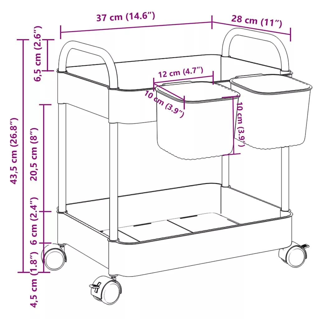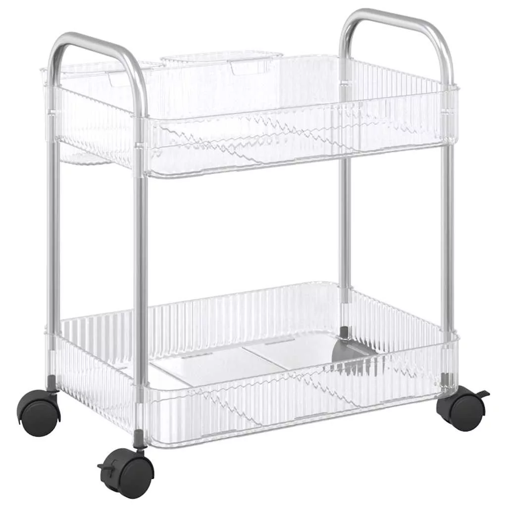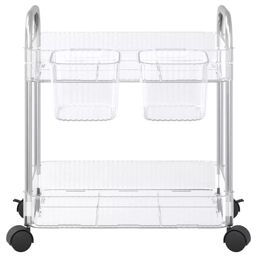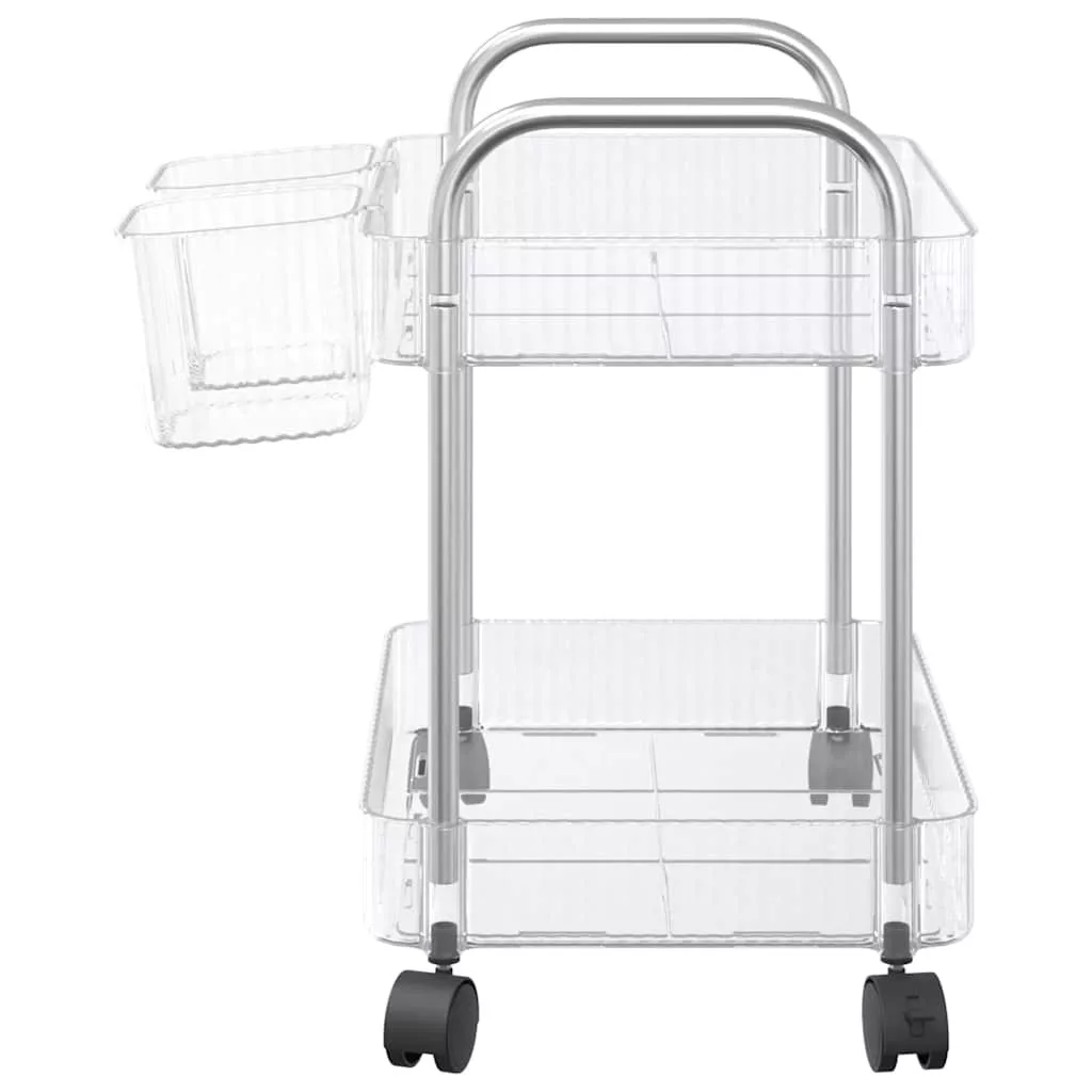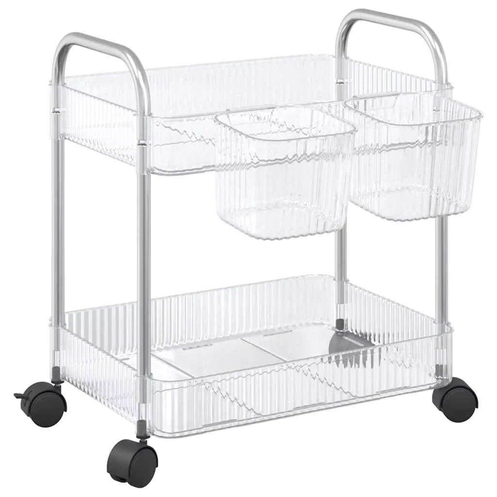 Ez a tárolókocsi ideális megoldást kínál különféle terek elrendezéséhez, beleértve a konyhát, a nappalit, a fürdőszobát, a mosókonyhát és az irodát.Könnyű és tartós: A robusztus akril kosarakból és rozsdamentes acél keretből készült tárolókocsi könnyű, stabil és tartós.Sokoldalú felhasználás: Ez a tárolókocsi sokoldalú, és különféle körülmények között használható, mint például a konyhában, a nappaliban, a fürdőszobában és az irodában. Segítségével az élelmiszerek, könyvek, piperecikkek és irodai kellékek szépen tárolhatók és könnyen hozzáférhetők legyenek.Extra tárolóhely: Ez a segédkocsi két extra akasztópohárral rendelkezik az apró tárgyak, például kések, villák, rágógumik, kulcsok és egyebek tárolására, így optimalizálva a helykihasználást.Könnyű mozgathatóság és biztonságos parkolás: Ez a tárolókocsi négy görgővel van felszerelve, amelyek közül kettő fékezett, így könnyedén áthelyezheti a kívánt helyre, és biztonságosan rögzítheti a helyére a nagyobb irányítás és biztonság érdekében.Kényelmes fogantyúk: Ennek a tárolókocsinak a tetején két fogantyúja van, így könnyen tolható és húzható a kényelmes mobilitás érdekében.