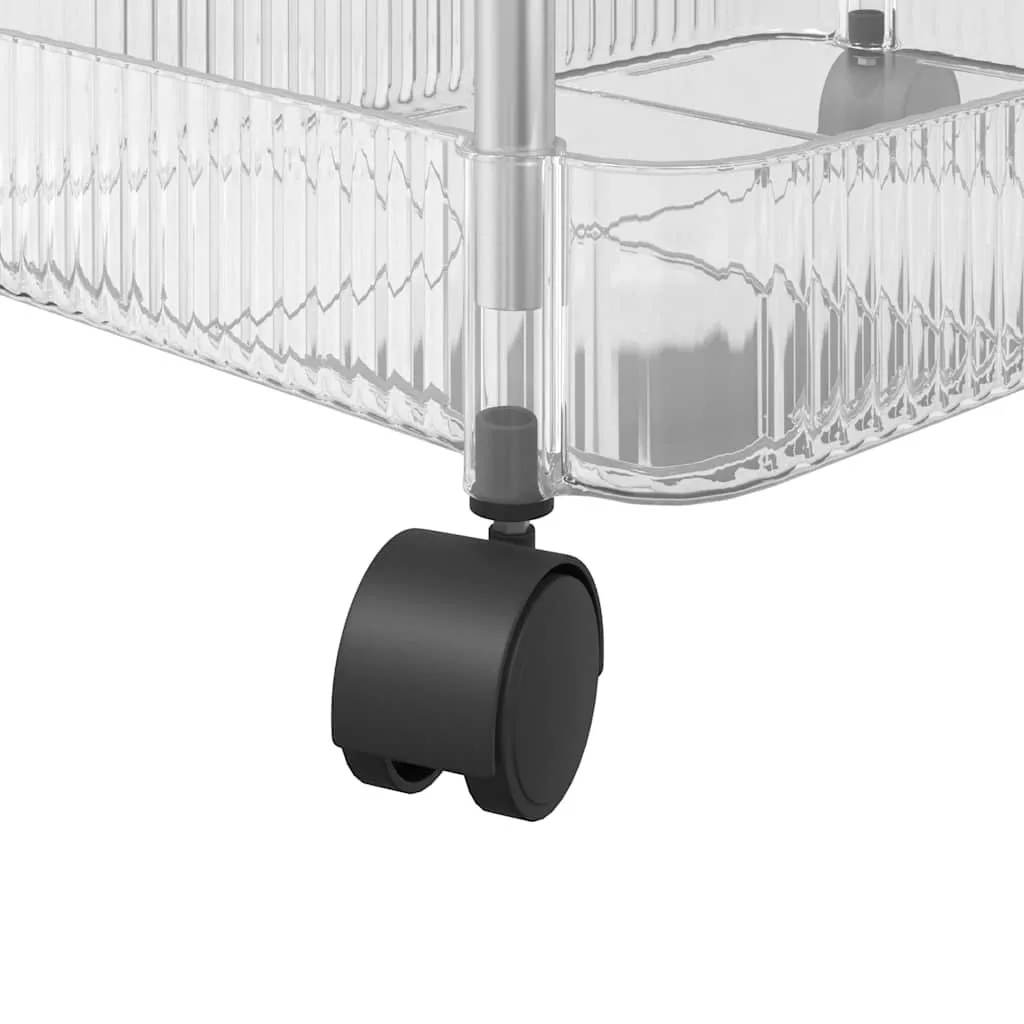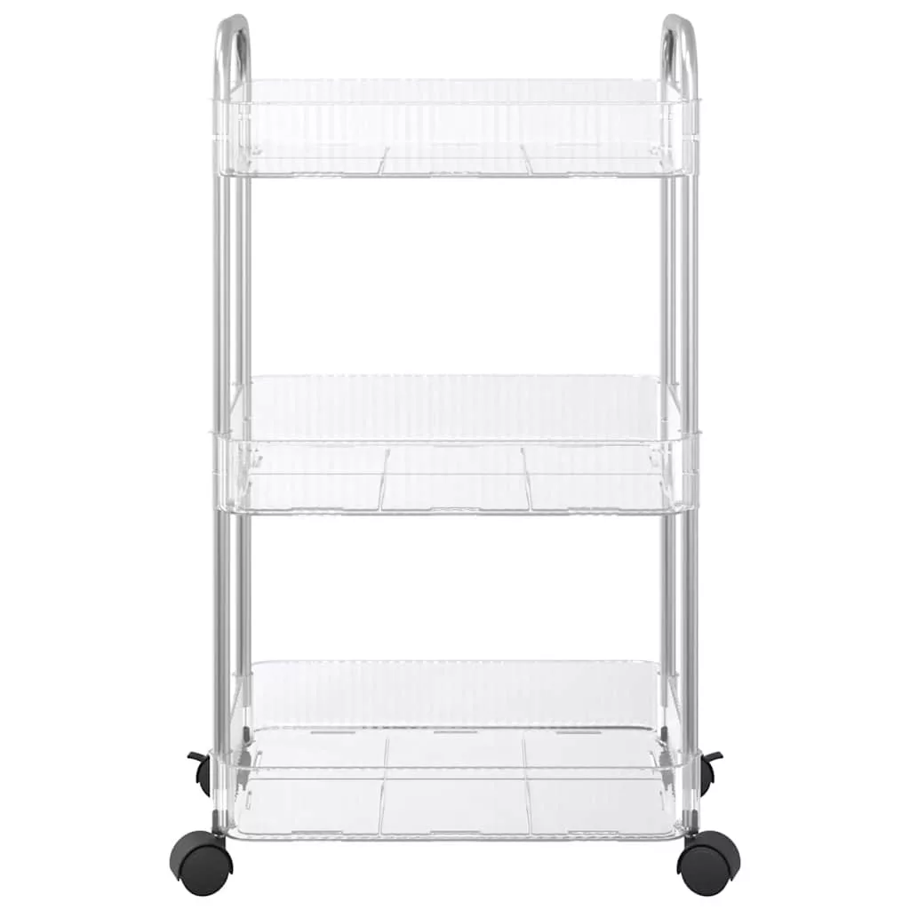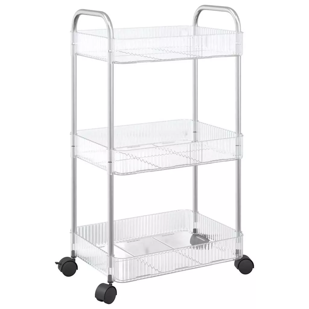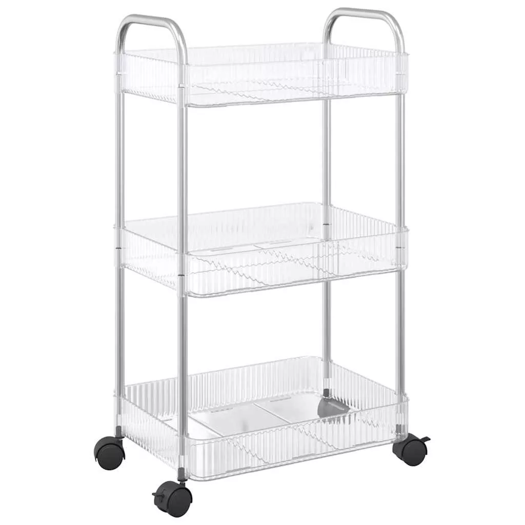Ez a tárolókocsi ideális megoldást kínál különféle terek elrendezéséhez, beleértve a konyhát, a nappalit, a fürdőszobát, a mosókonyhát és az irodát.Könnyű és tartós: A robusztus akril kosarakból és rozsdamentes acél keretből készült tárolókocsi könnyű, stabil és tartós.Sokoldalú felhasználás: Ez a tárolókocsi sokoldalú, és különféle körülmények között használható, mint például a konyhában, a nappaliban, a fürdőszobában és az irodában. Segítségével az élelmiszerek, könyvek, piperecikkek és irodai kellékek szépen tárolhatók és könnyen hozzáférhetők legyenek.Extra tárolóhely: Ez a segédkocsi két extra akasztópohárral rendelkezik az apró tárgyak, például kések, villák, rágógumik, kulcsok és egyebek tárolására, így optimalizálva a helykihasználást.Könnyű mozgathatóság és biztonságos parkolás: Ez a tárolókocsi négy görgővel van felszerelve, amelyek közül kettő fékezett, így könnyedén áthelyezheti a kívánt helyre, és biztonságosan rögzítheti a helyére a nagyobb irányítás és biztonság érdekében.Kényelmes fogantyúk: Ennek a tárolókocsinak a tetején két fogantyúja van, így könnyen tolható és húzható a kényelmes mobilitás érdekében.