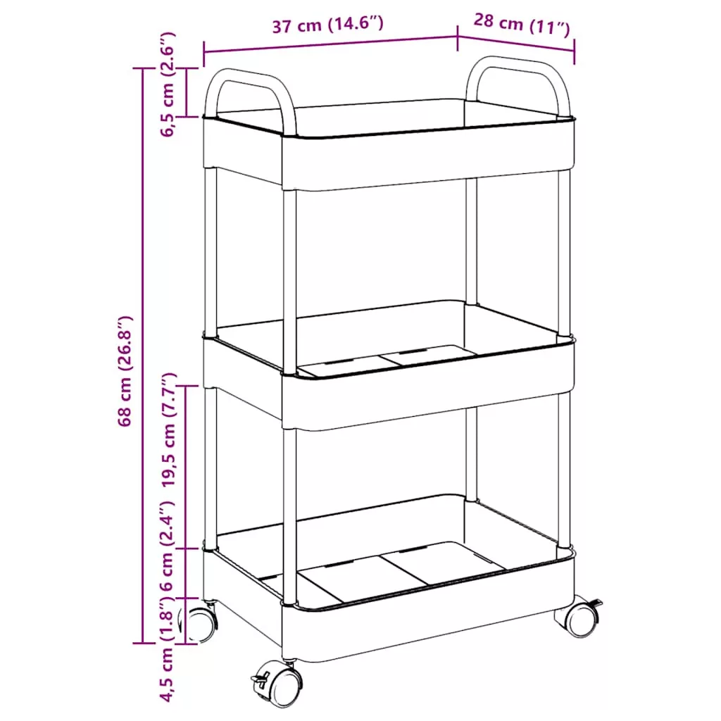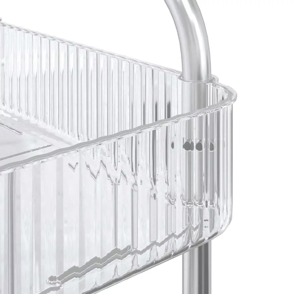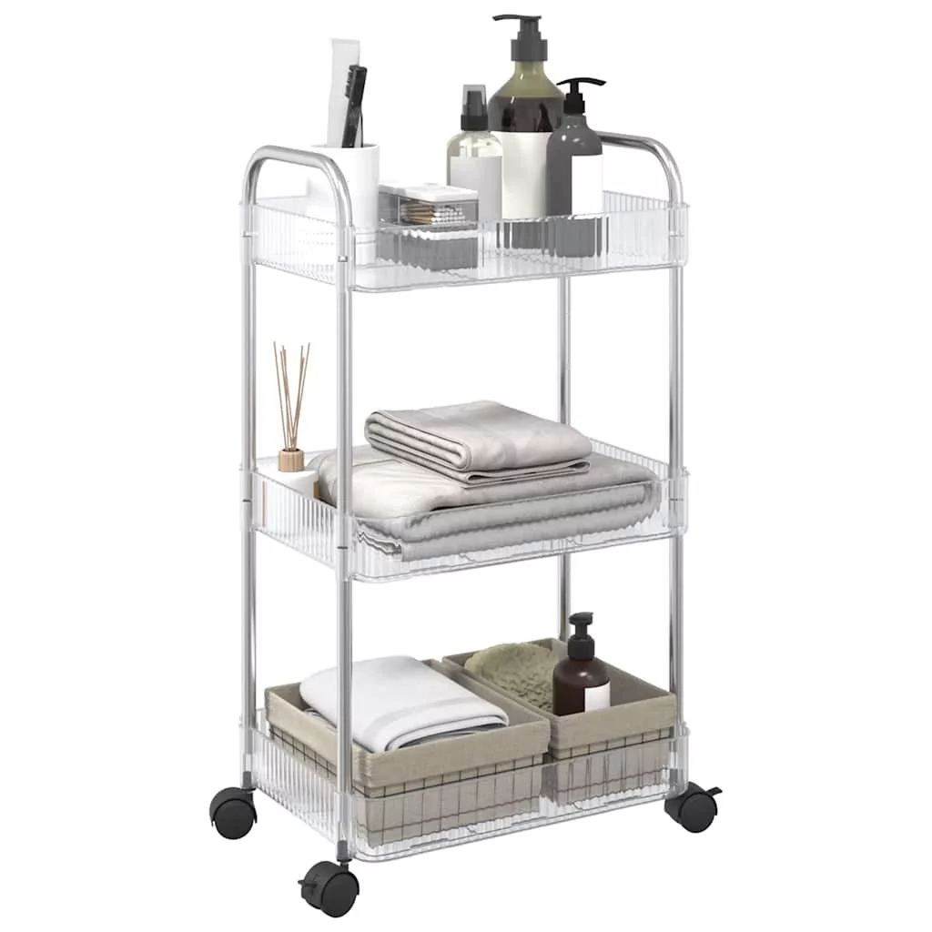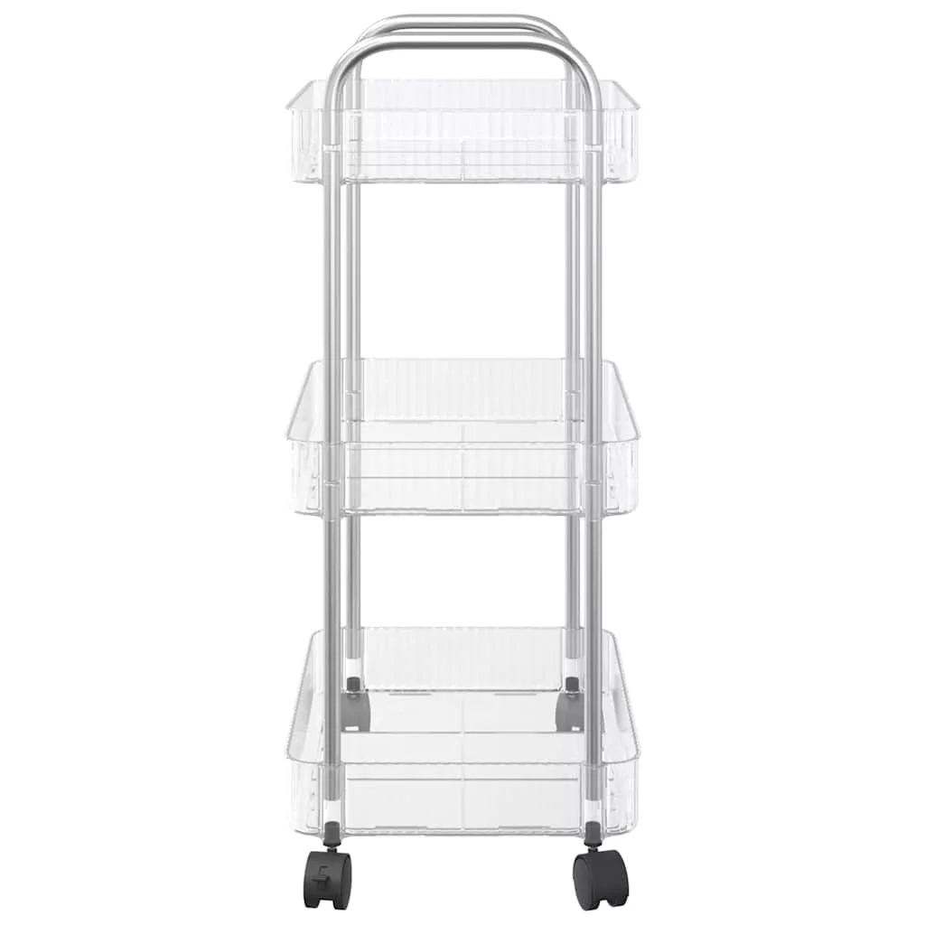 Ez a tárolókocsi ideális megoldást kínál különféle terek elrendezéséhez, beleértve a konyhát, a nappalit, a fürdőszobát, a mosókonyhát és az irodát.Könnyű és tartós: A robusztus akril kosarakból és rozsdamentes acél keretből készült tárolókocsi könnyű, stabil és tartós.Sokoldalú felhasználás: Ez a tárolókocsi sokoldalú, és különféle körülmények között használható, mint például a konyhában, a nappaliban, a fürdőszobában és az irodában. Segítségével az élelmiszerek, könyvek, piperecikkek és irodai kellékek szépen tárolhatók és könnyen hozzáférhetők legyenek.Extra tárolóhely: Ez a segédkocsi két extra akasztópohárral rendelkezik az apró tárgyak, például kések, villák, rágógumik, kulcsok és egyebek tárolására, így optimalizálva a helykihasználást.Könnyű mozgathatóság és biztonságos parkolás: Ez a tárolókocsi négy görgővel van felszerelve, amelyek közül kettő fékezett, így könnyedén áthelyezheti a kívánt helyre, és biztonságosan rögzítheti a helyére a nagyobb irányítás és biztonság érdekében.Kényelmes fogantyúk: Ennek a tárolókocsinak a tetején két fogantyúja van, így könnyen tolható és húzható a kényelmes mobilitás érdekében.