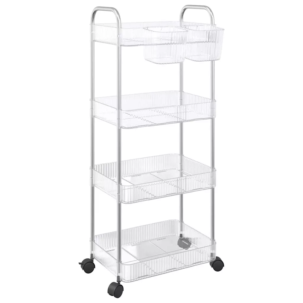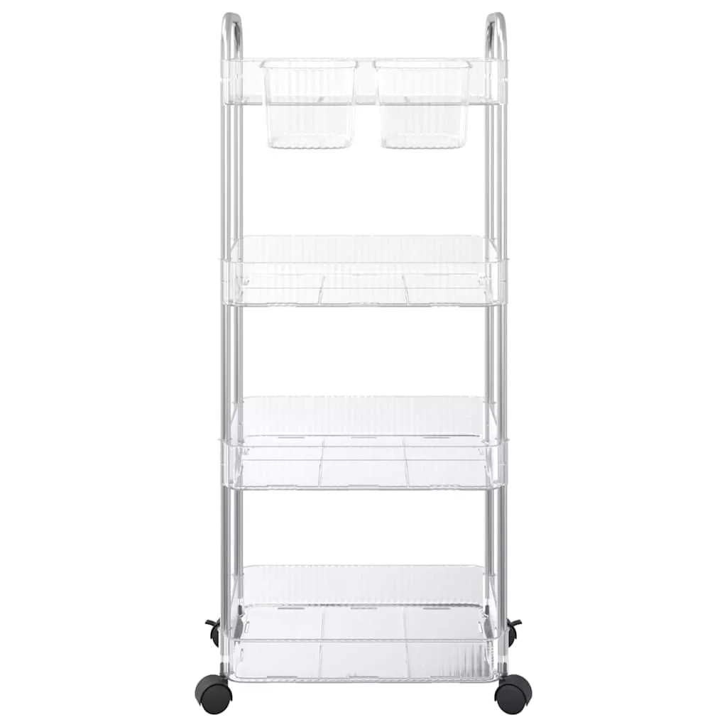 Ez a tárolókocsi ideális megoldást kínál különféle terek elrendezéséhez, beleértve a konyhát, a nappalit, a fürdőszobát, a mosókonyhát és az irodát.Könnyű és tartós: A robusztus akril kosarakból és rozsdamentes acél keretből készült tárolókocsi könnyű, stabil és tartós.Sokoldalú felhasználás: Ez a tárolókocsi sokoldalú, és különféle körülmények között használható, mint például a konyhában, a nappaliban, a fürdőszobában és az irodában. Segítségével az élelmiszerek, könyvek, piperecikkek és irodai kellékek szépen tárolhatók és könnyen hozzáférhetők legyenek.Extra tárolóhely: Ez a segédkocsi két extra akasztópohárral rendelkezik az apró tárgyak, például kések, villák, rágógumik, kulcsok és egyebek tárolására, így optimalizálva a helykihasználást.Könnyű mozgathatóság és biztonságos parkolás: Ez a tárolókocsi négy görgővel van felszerelve, amelyek közül kettő fékezett, így könnyedén áthelyezheti a kívánt helyre, és biztonságosan rögzítheti a helyére a nagyobb irányítás és biztonság érdekében.Kényelmes fogantyúk: Ennek a tárolókocsinak a tetején két fogantyúja van, így könnyen tolható és húzható a kényelmes mobilitás érdekében.