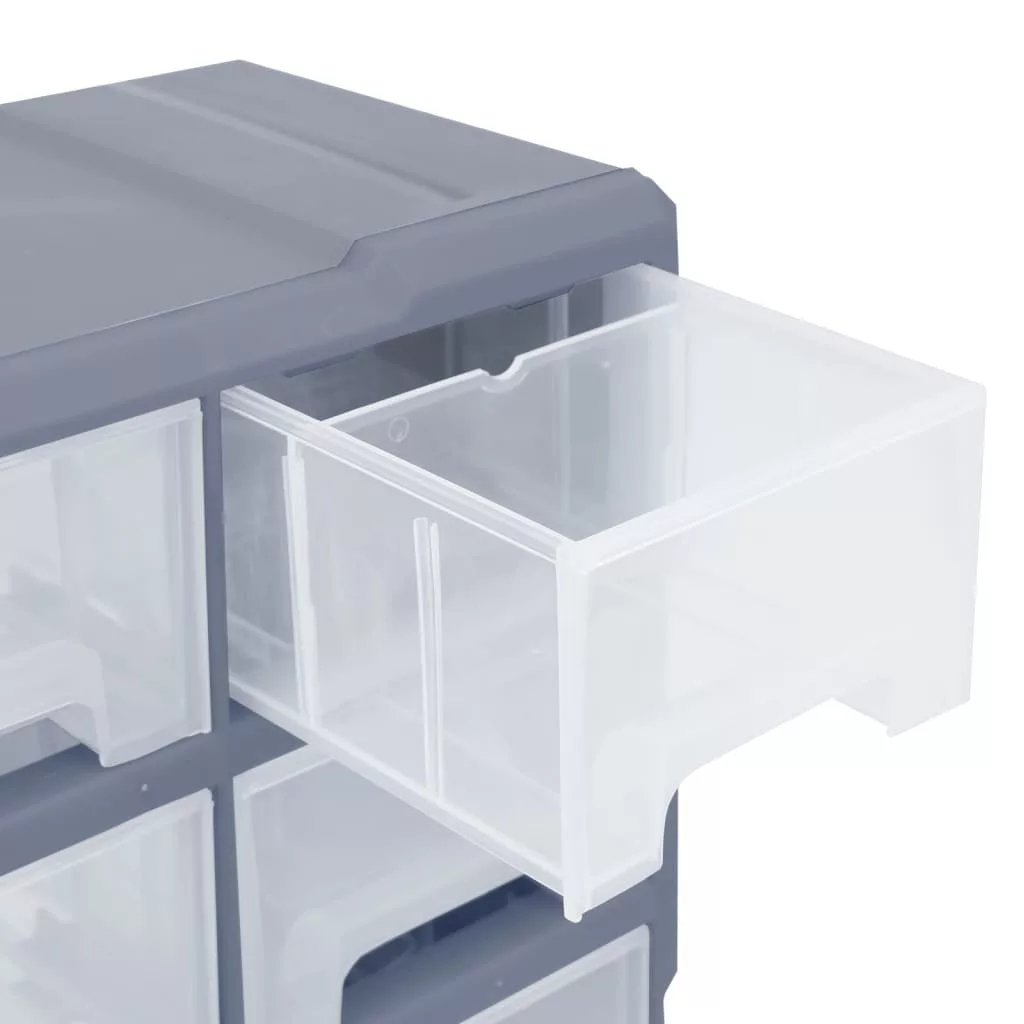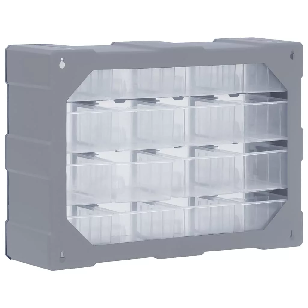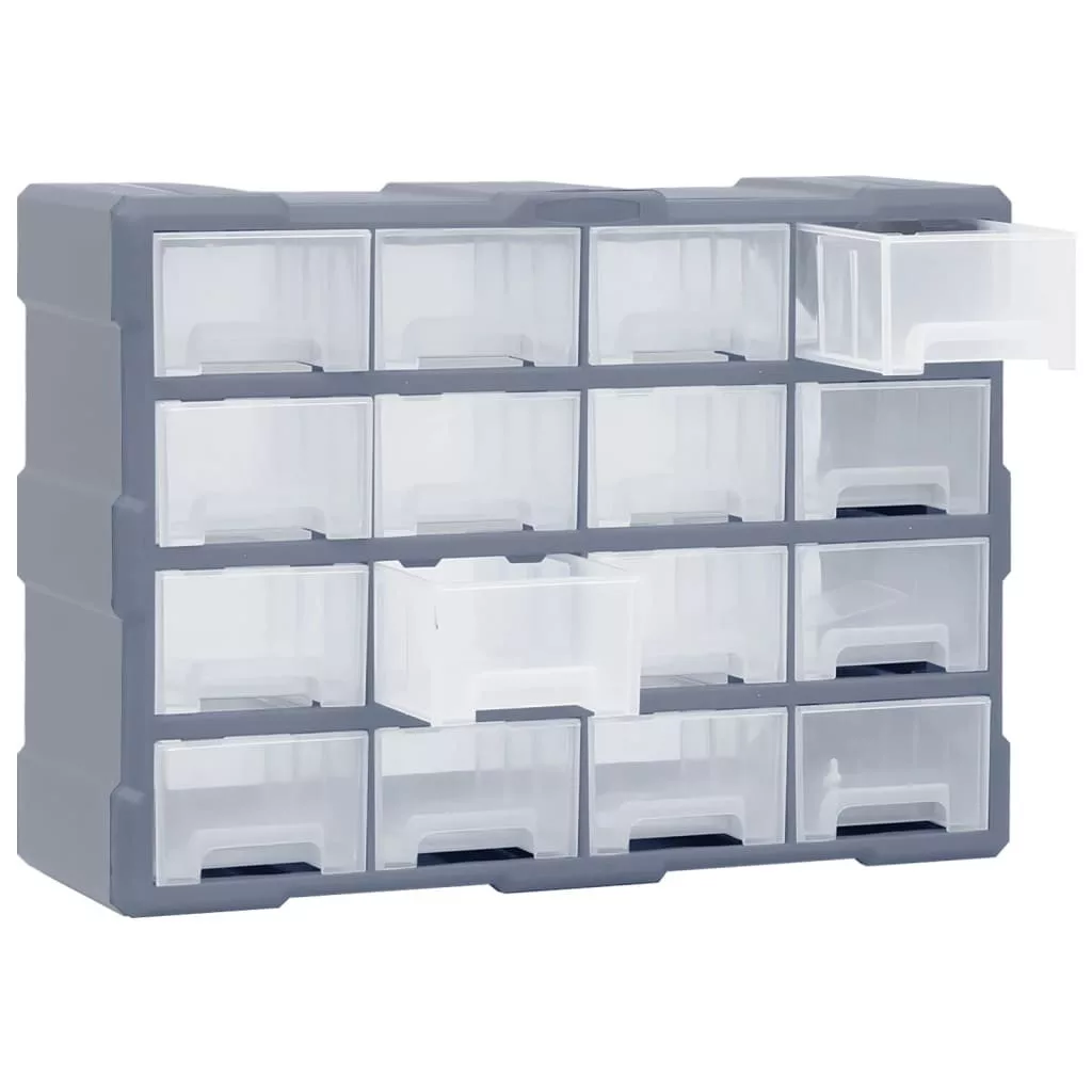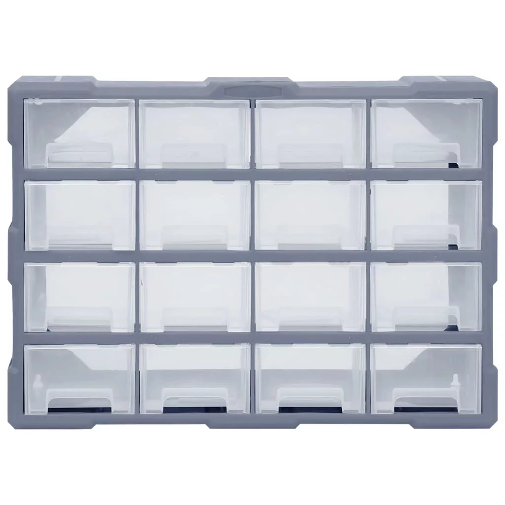 Ez a 16 közepes méretű fiókkal ellátott nélkülözhetetlen tároló a legkülönfélébb tárgyak rendezett tárolására szolgál. Varróeszközök vagy szögek tárolására is használható. Ez a tárolóegység 16 közepes méretű fiókot tartalmaz a napi igényeinek kielégítésére. Rendezetten és kézközelben tárolhatja benne a kéziszerszámokat és a kiegészítőket, például a kapcsokat. A szerszámszekrény ütésálló műanyagból készült, így egyaránt tartós és stabil. A fiókok azonban átlátszó műanyagból készültek, így gyorsan azonosítható a tartalmuk. A szerszámdoboz ideális anyák, csavarok, szegek, általános kellékek és alkatrészek tárolására. Ez a termék falra is szerelhető, és különálló szerszámtárolóként is használható.