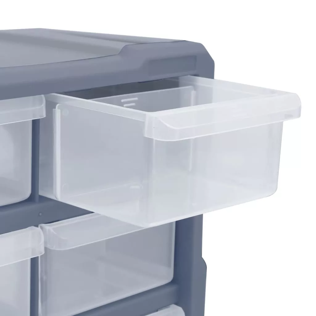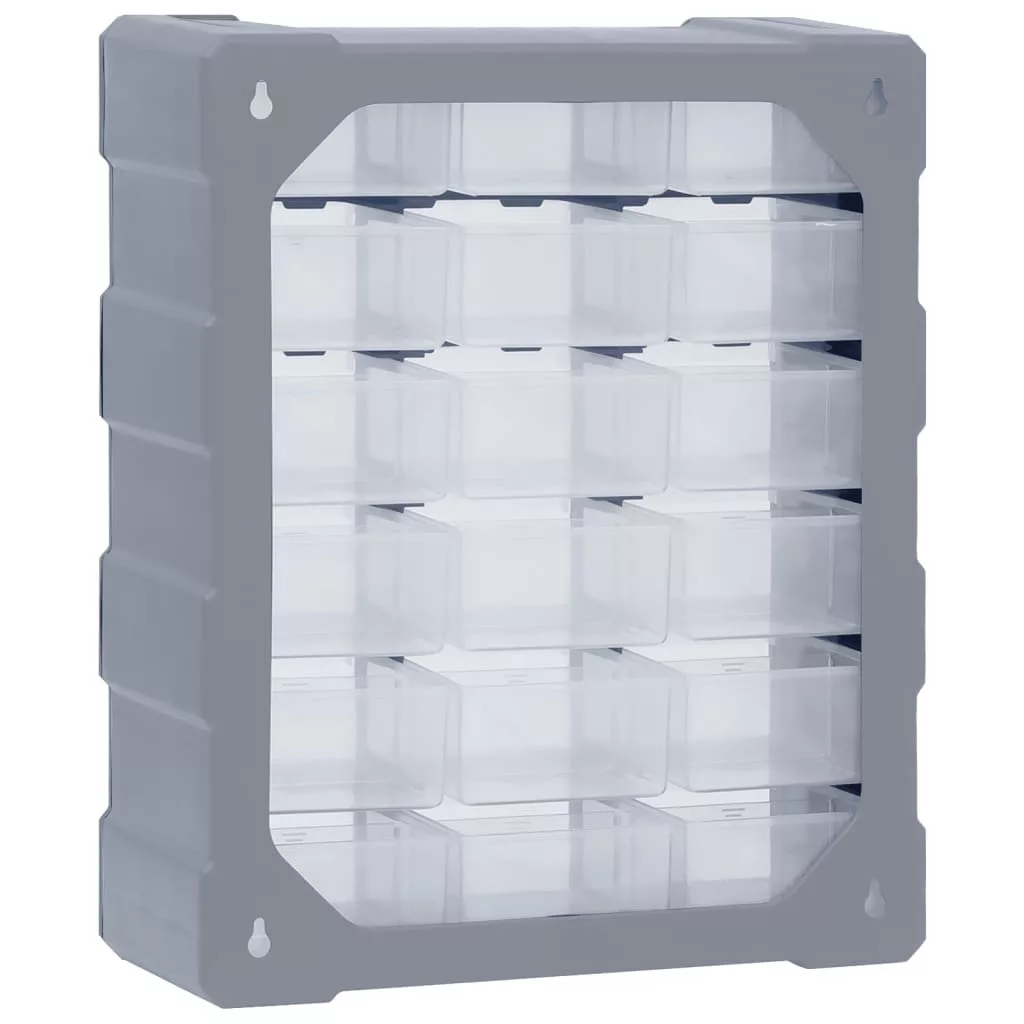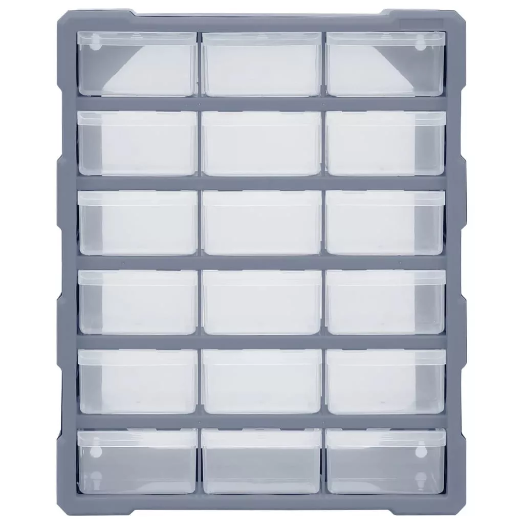 Ez a 18 középső fiókkal ellátott nélkülözhetetlen tároló a legkülönfélébb tárgyak rendezett tárolására szolgál. Varróeszközök vagy szögek tárolására is használható. Ez a tárolóegység 18 középső fiókot tartalmaz a napi igények kielégítésére. Rendezetten és kézközelben tárolhatja benne a kéziszerszámokat és a kiegészítőket, például a rögzítőket. A szerszámszekrény ütésálló műanyagból készült, így egyaránt tartós és stabil. Az átlátszó műanyag fiókok tartalma gyorsan azonosítható. A szerszámdoboz ideális anyák, csavarok, szegek, általános kellékek és alkatrészek tárolására. Ez a termék falra is szerelhető, és különálló szerszámtárolóként is használható.