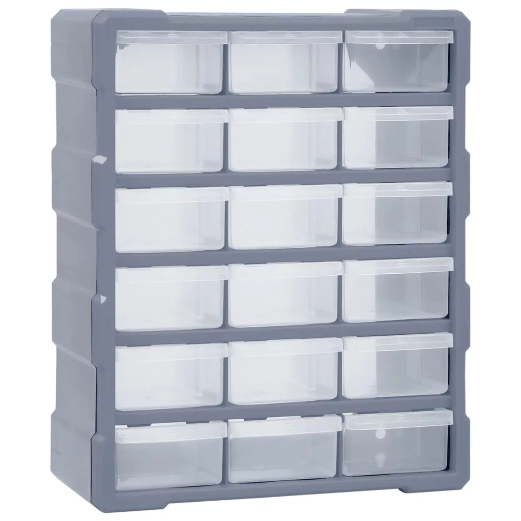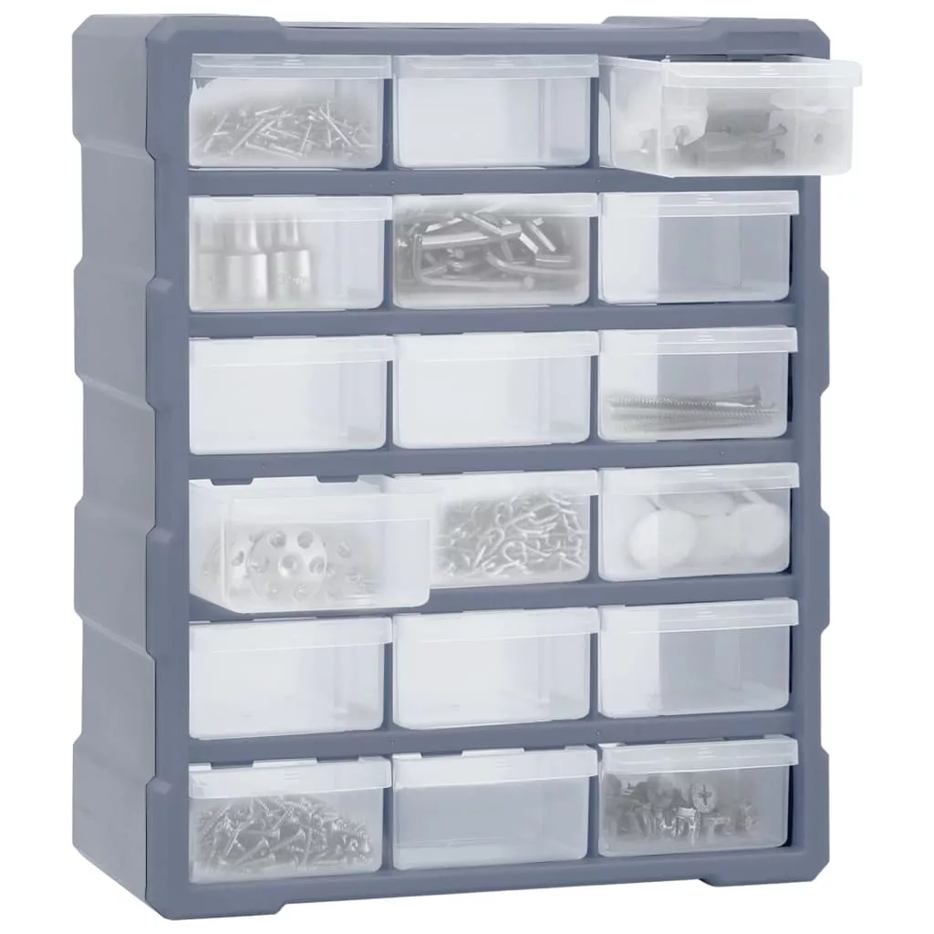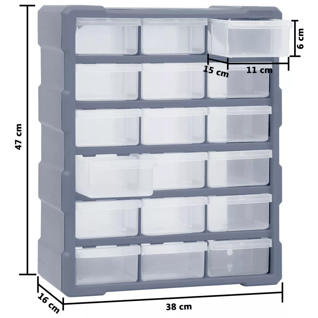 Ez a 18 középső fiókkal ellátott nélkülözhetetlen tároló a legkülönfélébb tárgyak rendezett tárolására szolgál. Varróeszközök vagy szögek tárolására is használható. Ez a tárolóegység 18 középső fiókot tartalmaz a napi igények kielégítésére. Rendezetten és kézközelben tárolhatja benne a kéziszerszámokat és a kiegészítőket, például a rögzítőket. A szerszámszekrény ütésálló műanyagból készült, így egyaránt tartós és stabil. Az átlátszó műanyag fiókok tartalma gyorsan azonosítható. A szerszámdoboz ideális anyák, csavarok, szegek, általános kellékek és alkatrészek tárolására. Ez a termék falra is szerelhető, és különálló szerszámtárolóként is használható.