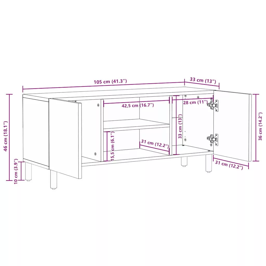 Ez a bőséges tárolóhellyel rendelkező TV-szekrény nappalija vagy hálószobája praktikus és szemet gyönyörködtető kiegészítője lesz. Robusztus és stabil anyag: A tömör akácfa az erősségéről és tartósságáról ismert. Változatos színeinek és egyedi erezetmintájának köszönhetően vonzó megjelenésű. Jó stabilitásának és időjárás-állóságának köszönhetően ideális beltéri és kültéri bútorok készítéséhez.Bőséges tárolóhely: Ez a TV-állvány bőséges tárolóhelyet biztosít, hogy magazinjai, könyvei, DVD-i és multimédiás eszközei jól rendszerezve és elérhető közelségben legyenek.Stabil és erős asztallap: A masszív lap ideális a TV és a sztereórendszer, vagy dísztárgyak, például vázák vagy cserepes növények elhelyezésére.Lábakkal: A megemelt lábak megkönnyítik a TV-pad alatti tisztítást, megőrizve a rendezett megjelenést és biztosítva a jobb légáramlást az elektronikus berendezések körül. Jó tudni:Minden termék egyedi, a szín és az erezet változik. A kiszállítás véletlenszerűen történik, biztosítva terméke exkluzivitását és egyediségét.