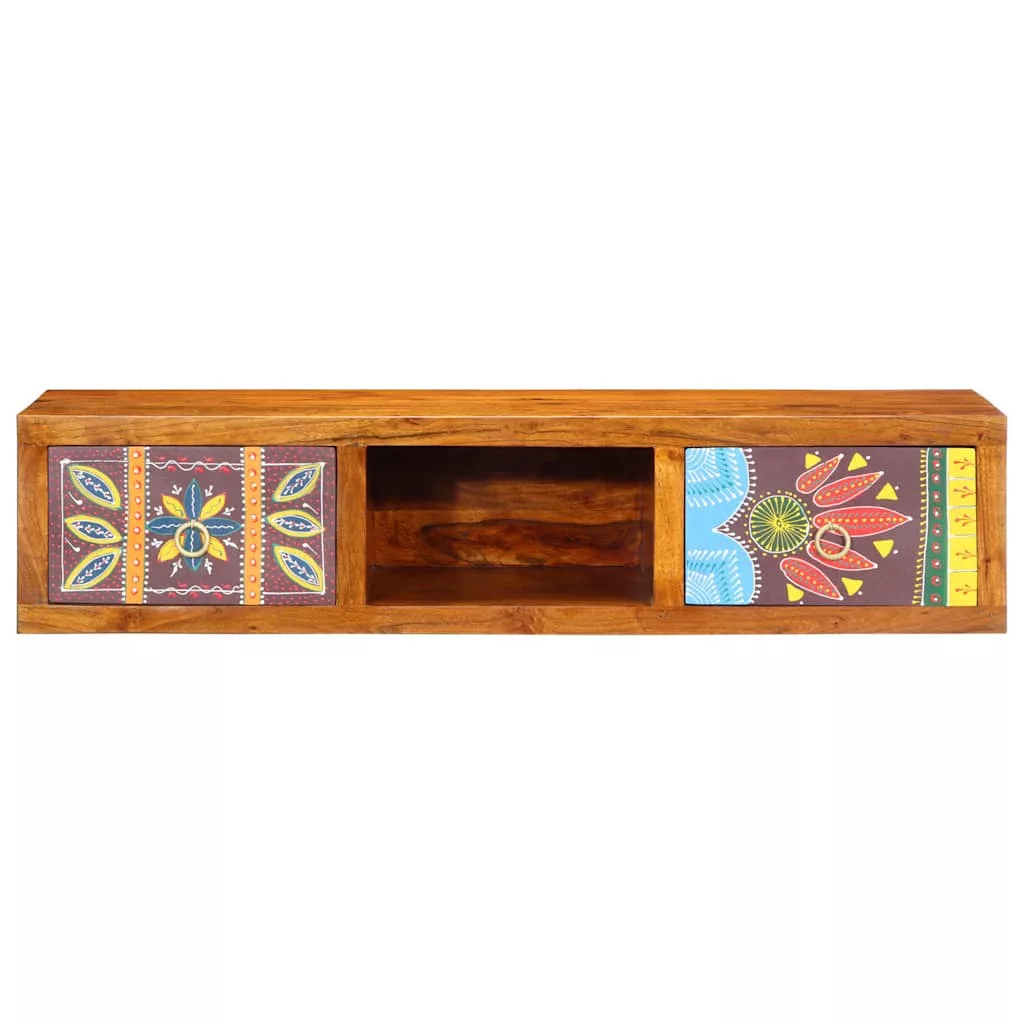 Ez a falra szerelhető TV-szekrény tökéletes megoldás a lakótérben, hogy maximalizálja a helyet, és a padlófelületeket rendben tartsa. Robusztus és stabil anyag: A tömör akácfa az erősségéről és tartósságáról ismert. Változatos színeinek és egyedi erezetmintájának köszönhetően vonzó megjelenésű. Jó stabilitásának és időjárás-állóságának köszönhetően ideális beltéri és kültéri bútorok készítéséhez.Bőséges tárolóhely: Ez a TV-szekrény bőséges helyet kínál folyóiratai, könyvei, DVD-i és multimédiás eszközei kézközelben történő rendezett tárolásához.Élénk szépség: A TV komód kézzel festett, élénk színekkel vegyített dizájnnal rendelkezik, így szemet gyönyörködtető hangsúlyt ad bármely helyiségnek, és egyedi művészi hangulattal gazdagítja lakberendezését.Helytakarékos: A tévészekrény falra szerelhető, így extra tárolóhelyet biztosít. Így maximálisan kihasználhatja az alapterületet, és tisztán tarthatja a területet.Könnyen karbantartható: Ez a fali TV-szekrény könnyen tisztítható nedves ruhával, és kevesebb karbantartást igényel. Jó tudni:A falon belüli csavarok és dugók nem alaptartozékok. Azt tanácsoljuk, hogy keressen és használjon kifejezetten az Ön falához megfelelő csavarokat és dugókat. Ha nem biztos benne, konzultálhat egy szakemberrel. Kérjük, olvassa el és kövesse az utasítások minden lépését.Minden termék egyedi, a szín és az erezet változik. A kiszállítás véletlenszerűen történik, biztosítva terméke exkluzivitását és egyediségét.