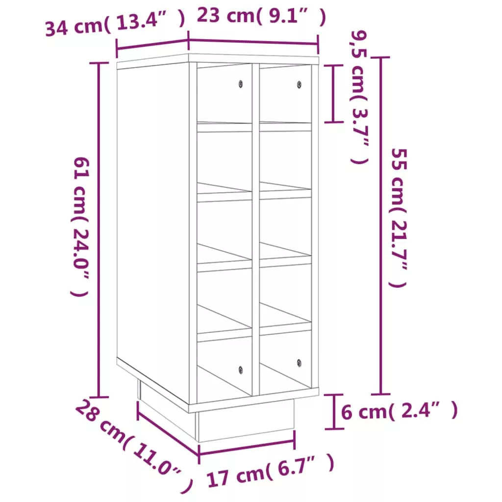Tárolja, érlelje és mutassa be stílusosan borait ezzel a fa borszekrénnyel! Borrajongóknak tökéletes. Természetes anyag: A tömör fenyőfa egy gyönyörű természetes anyag. A fenyőfa egyenes erezetű, a csomók pedig jellegzetes, rusztikus megjelenést kölcsönöznek a bútornak.Bőséges tárolóhely: A boros szekrény bőséges tárolóhelyet biztosít a borok tárolására. Ideális akár 10 üveg bor tárolására.Masszív váz: A faváz erős szerkezetet és stabilitást biztosít. Megjegyzés:Az egyszerű összeszerelés érdekében minden termékhez mellékelünk összeszerelési útmutatót. Figyelem:A dőlés megakadályozása érdekében a terméket a mellékelt tartóelem segítségével rögzíteni kell a falhoz.