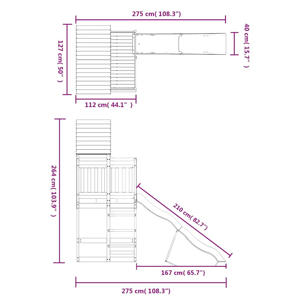 Szeretné, ha gyermekei szabadon játszhatnának otthon? Ez a fából készült játszószett varázslatos kalandok játszóterévé varázsolja kertjét! Tartós anyag: Ez a játszószett tömör fenyőfából készült. A tömör fenyőfa egy gyönyörű, természetes anyag. A fenyőfa egyenes erezetű, a csomók pedig jellegzetes, rusztikus megjelenést biztosítanak az anyagnak.Erős és stabil váz: A játszótéri eszköz fa váza erős szerkezetet és stabilitást biztosít.Multi-aktivitási központ: A fa játszószett 118 cm magas emelvénnyel, valamint hullámos csúszdával és homokozóval rendelkezik. A kicsik barátaikat is meghívhatják játszani.Átgondolt kialakítás: A környező fa korlátokat úgy tervezték, hogy biztosítsák a gyermekek biztonságát játszás közben. Ezenkívül a fa tető árnyékot biztosít gyermekeinek a forró nyári napokon.Végtelen szórakozás: Ez a rengeteg szórakozást kínáló, fából készült játszótér tökéletes arra, hogy gyermekei és barátaik szórakozzanak, több interaktív időt töltsenek együtt, és emlékeket szerezzenek! Figyelem:Csak háztartási használatraKültéri használatra3 évesnél kisebb gyermekek számára nem alkalmas Ajánlott életkor: 3-8 év Figyelem. 3 év alatti gyermekek számára nem alkalmas. Csak háztartási használatra.