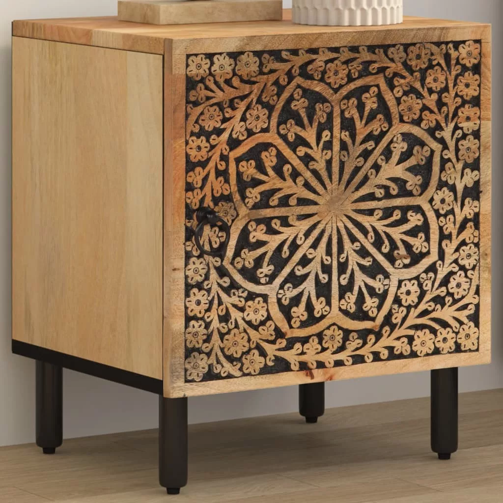 Ez a retró kialakítású éjjeliszekrény otthona időtálló kiegészítője lesz. Tömör mangófa: A tömör mangófa egy erős, trópusi keményfa, melyből strapabíró bútorok készíthetőek. A fa gyönyörű erezetének köszönhetően minden darab kissé különbözik a többitől. A tömör mangófából készült szekrény rendkívül tartós és stabil.Praktikus ajtó: Tartsa rendben környezetét azzal, hogy a kisebb tárgyakat az éjjeliszekrény ajtaja mögé rejti.Stabil asztallap: A kisszekrény teteje tökéletes dísztárgyak, képkeretek és cserepes növények elhelyezésére.Erős lábak: Ennek a hálószobabútornak a vaslábai robusztusságot és a stabilitást biztosítanak.Retro stílus: Ez a kézzel faragott virágmintákkal díszített éjjeliszekrény a retro stílus luxusát viszi otthonába, így garantáltan a szoba központi eleme lesz. Jó tudni:Minden termék egyedi, a szín és az erezet változik. A kiszállítás véletlenszerűen történik, biztosítva terméke exkluzivitását és egyediségét.