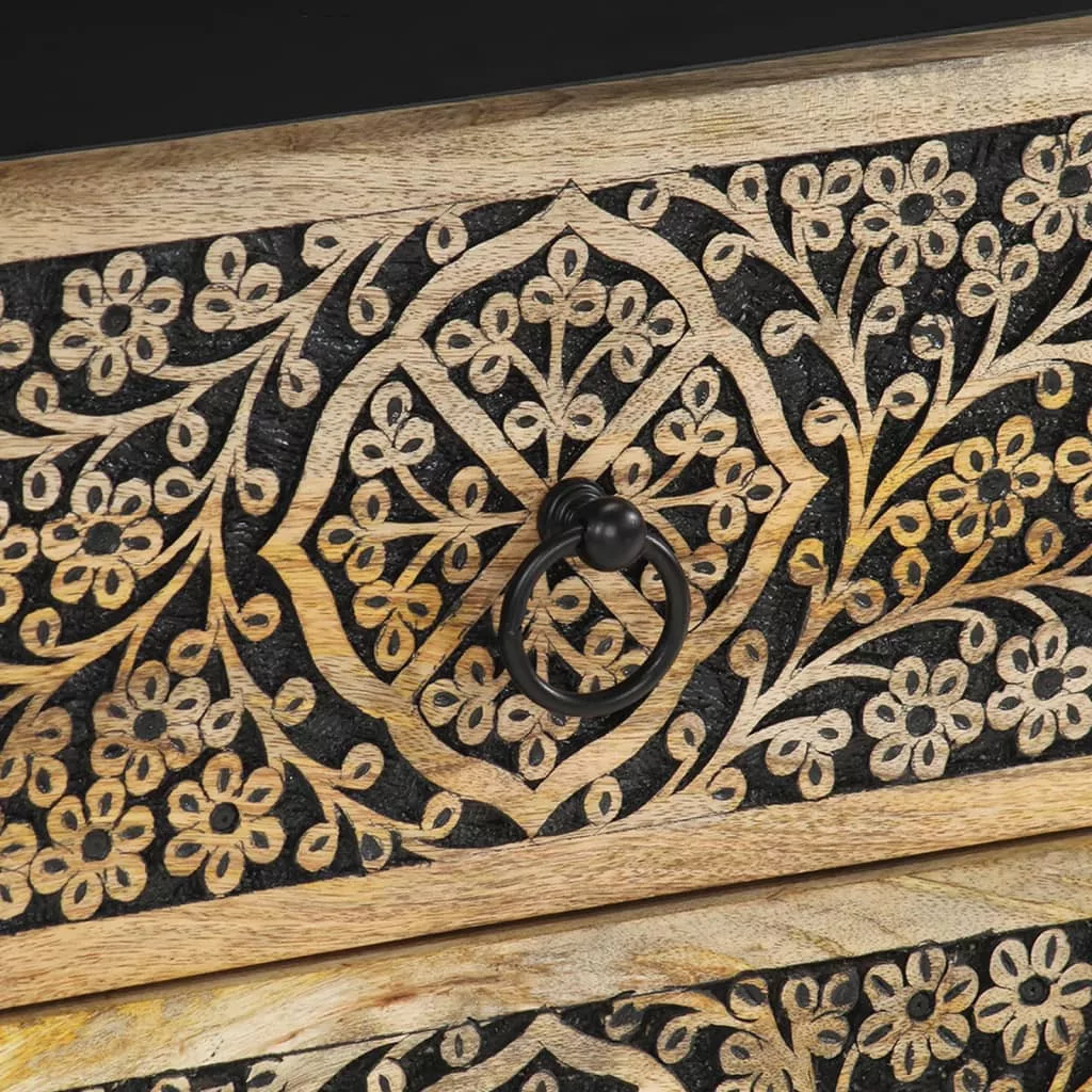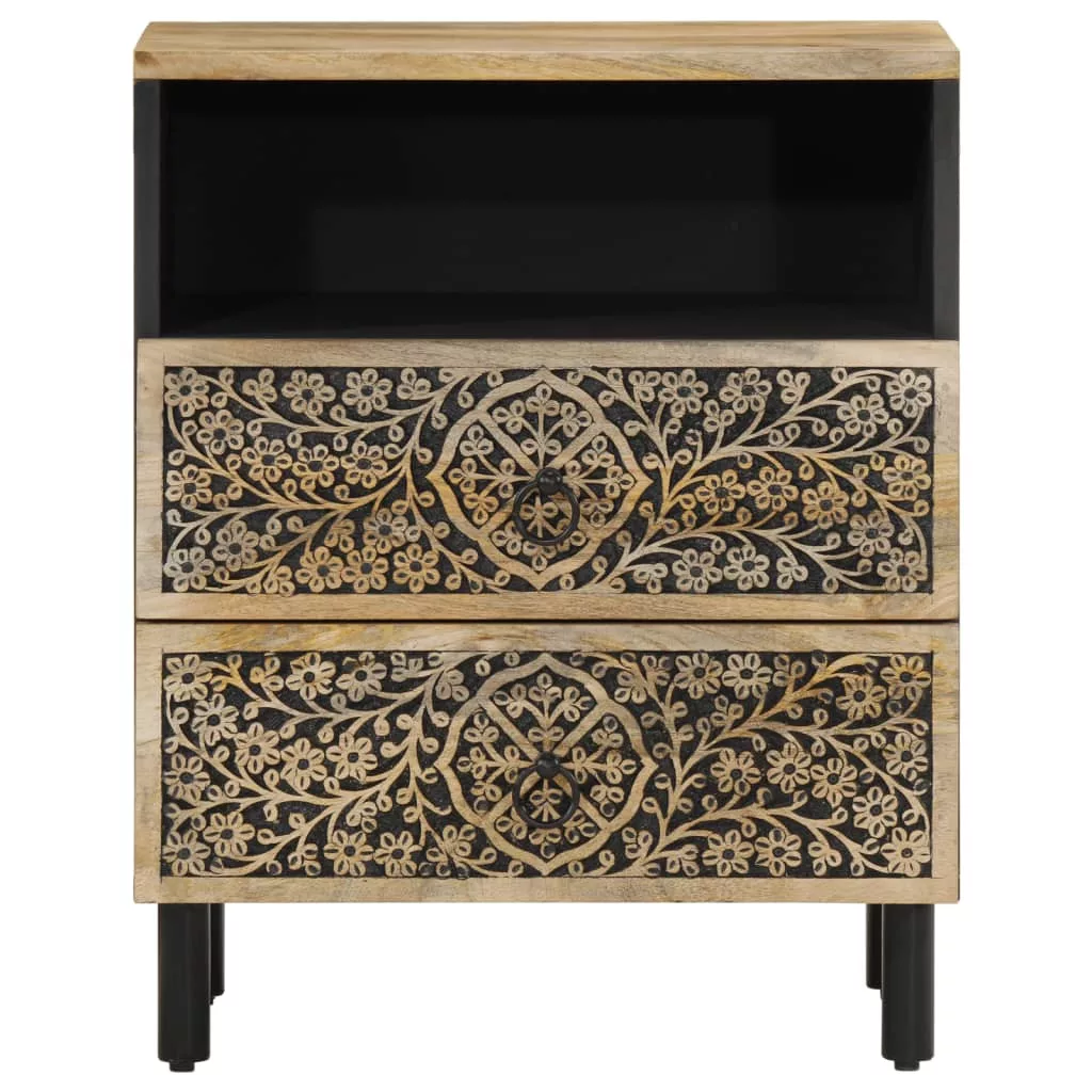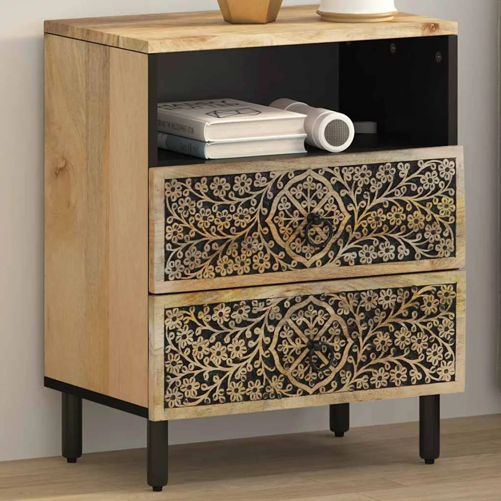 Ez az elegáns kialakítású éjjeliszekrény otthona időtálló kiegészítője. Tömör mangófa: A tömör mangófa egy erős, trópusi keményfa, melyből strapabíró bútorok készíthetőek. A fa gyönyörű erezetének köszönhetően minden darab kissé különbözik a többitől. A tömör mangófából készült szekrény rendkívül tartós és stabil.Bőséges tárolóhely: Az éjjeliszekrény 2 fiókkal és 1 rekesszel rendelkezik holmijai elérhető közelségben történő, rendezett tárolásához.Stabil asztallap: A kisszekrény teteje tökéletes dísztárgyak, képkeretek és cserepes növények elhelyezésére.Erős lábak: Ennek a hálószobabútornak a vaslábai robusztusságot és a stabilitást biztosítanak.Retro stílus: Ez a kézzel faragott virágmintákkal díszített éjjeliszekrény a retro stílus luxusát viszi otthonába, így garantáltan a szoba központi eleme lesz. Jó tudni:Minden termék egyedi, a szín és az erezet változik. A kiszállítás véletlenszerűen történik, biztosítva terméke exkluzivitását és egyediségét. Figyelem:A felborulás elkerülése érdekében ezt a terméket a mellékelt fali rögzítőeszközzel kell használni.